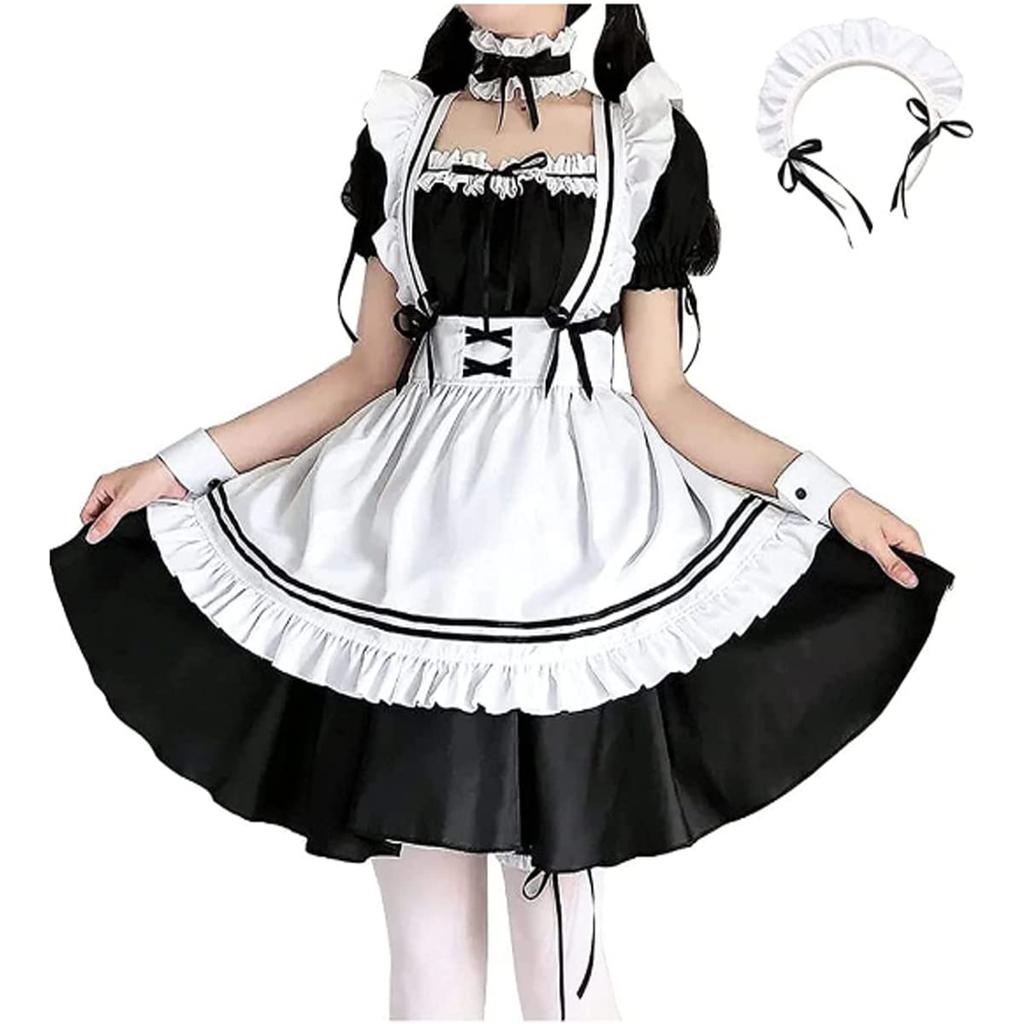 [Роскошный набор из 8 предметов] Цельное платье (черный), цельный фартук (белый), цельный ободок, цельный чокер (шея), запонки из двух частей (оружие), и двухкомпонентные подвязочные кольца (одно бедро).