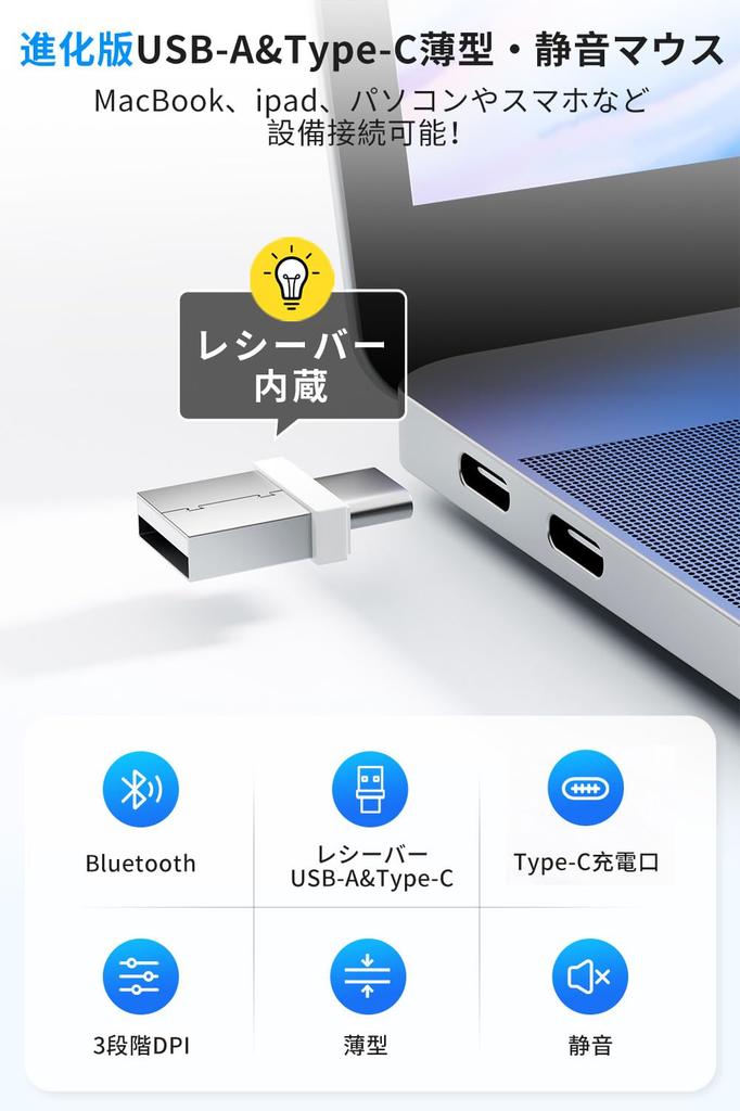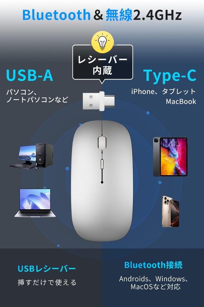 [Последняя версия, совместимость с Type-C, 400 мАч] Эта беспроводная мышь оснащена USB-A и Type-C 2-в-1 приемником, позволяющим удобно переключаться между устройствами в зависимости от окружения. Порт зарядки Type-C обеспечивает удобное, беспрепятственное подключение кабеля и более быструю зарядку. Он также оснащен встроенным литиевым аккумулятором высокой емкости 400 мАч, что исключает необходимость замены батареи и обеспечивает до двух месяцев использования на одном заряде.. Он автоматически переходит в спящий режим при неиспользовании для экономии энергии и может быть возобновлен одним щелчком.