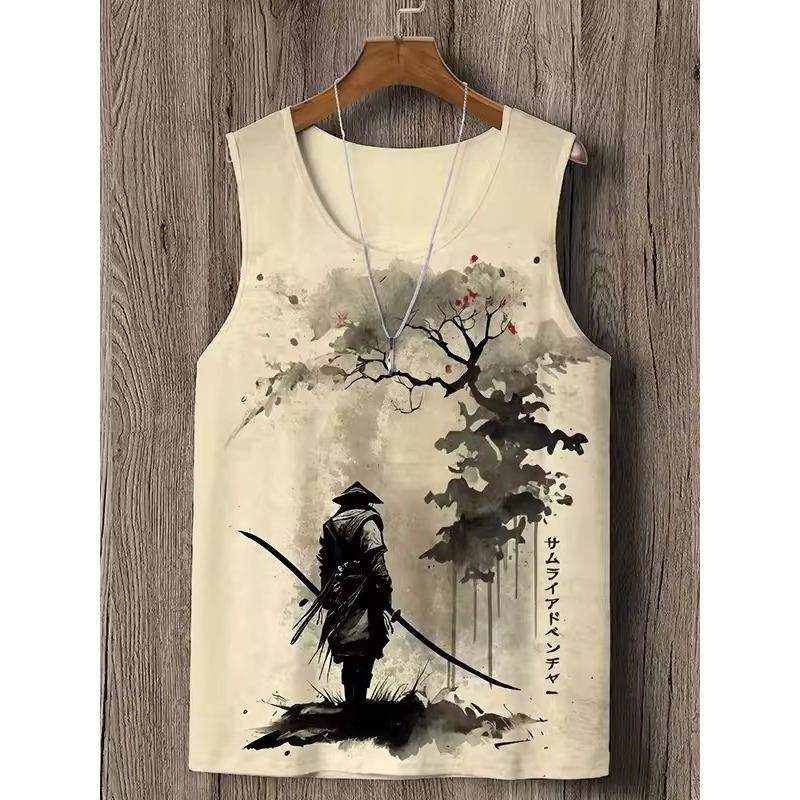 Винтажная майка в японском стиле, аниме, самурайский кот, 3D-принт, футболка без рукавов, повседневная, свободная, дышащая, смешной топ, мужская майка