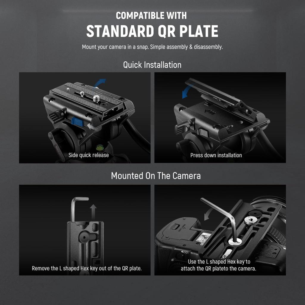 【Широкая совместимость и легкая установка аксессуаров】Быстросъемная площадка с винтами 1/4"-20 и 3/8"-16 (встроенный гаечный ключ) совместим с различными зеркальными камерами, беззеркальными камерами, видеокамерами, стабилизаторами, видеоустановками и т. д.. Винт 1/4" сбоку позволяет подключать аксессуары для расширения внешних устройств, таких как мониторы, светодиодные фонари и волшебные руки.