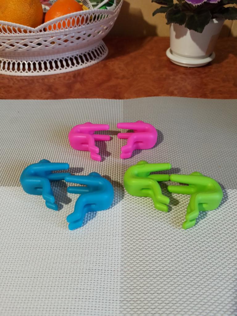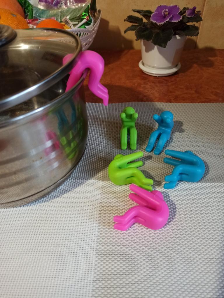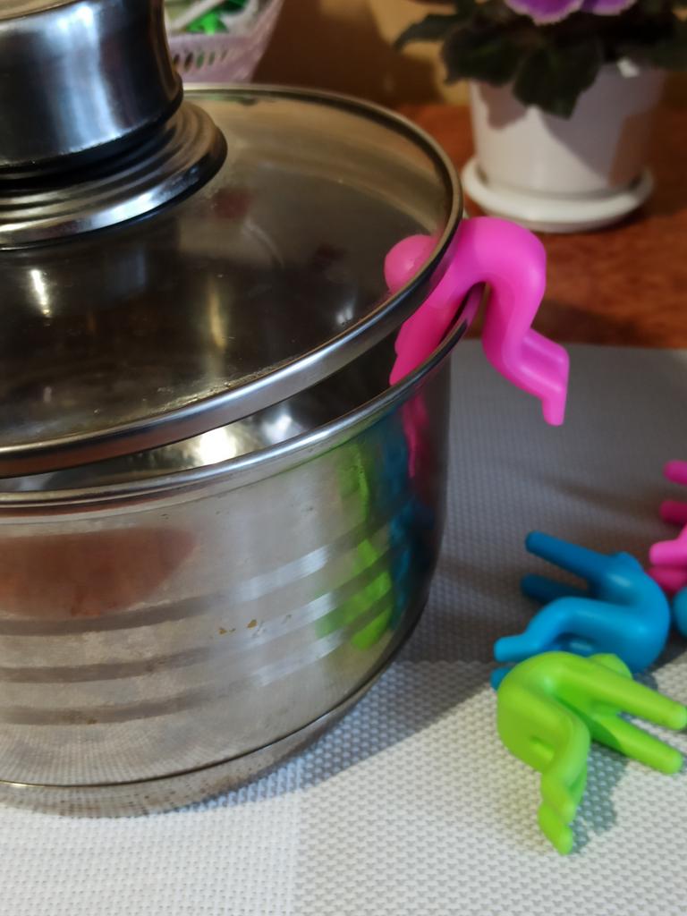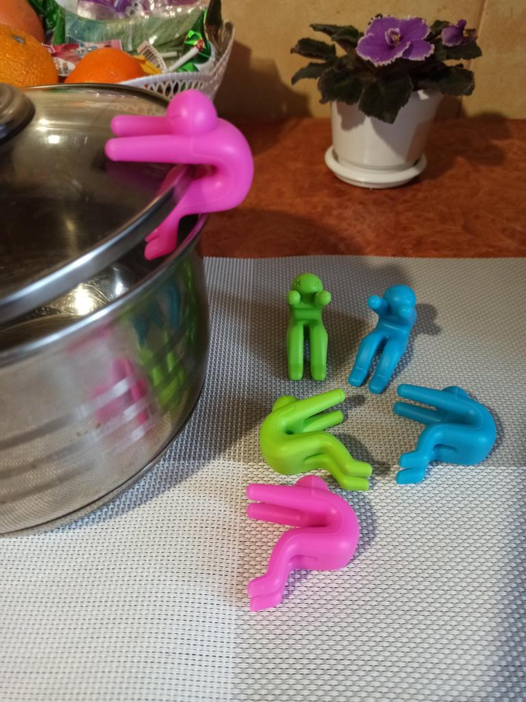 Держатель крышки на кастрюлю, сковороду У продавца можно заказать как 1, так и 6 Цвета приходят рандомно, мне пришло: 2 белых, 2 салатовых и 2 черных. Изготовлены из пищевого термостойкого силикона. Это оригинальный способ, чтобы во время приготовления еды можно было оставить кастрюлю немного приоткрытой. Держатель сделан в форме человечка, он удобно крепится прямо между крышкой и самим бортиком кастрюли. Более того, эти человечки универсальны в использовании, ведь их можно также применять в качестве подставки для палочек суши, или же других бытовых мелочей. Держатель отлично справляется со своей задачей. Однозначно РЕКОМЕНДУЮ!