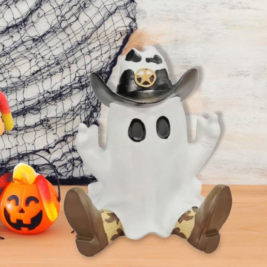 Дизайн Призрачного Ковбоя: Выделитесь с этой очаровательной статуей ковбоя-призрака, украшенной причудливой ковбойской шляпой, добавляющей отличительный штрих вашему хэллоуинскому декору.. Оцените очарование ковбойского декора с этим привлекательным элементом.