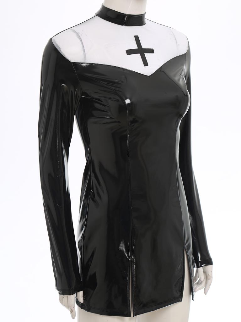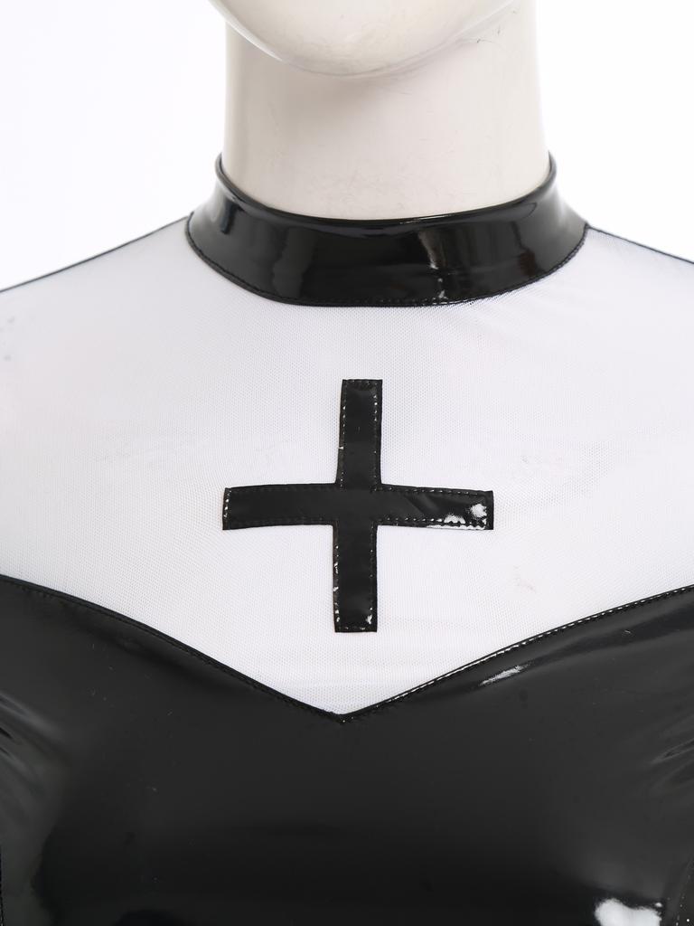 Женский костюм монахини на Хэллоуин, мини-облегающее платье с воротником-стойкой, длинными рукавами, сетчатой вставкой в стиле пэчворк с крестом, разрезом по подолу, наряд для вечеринки
