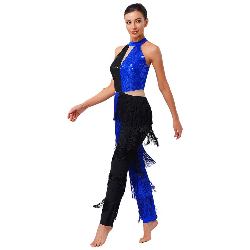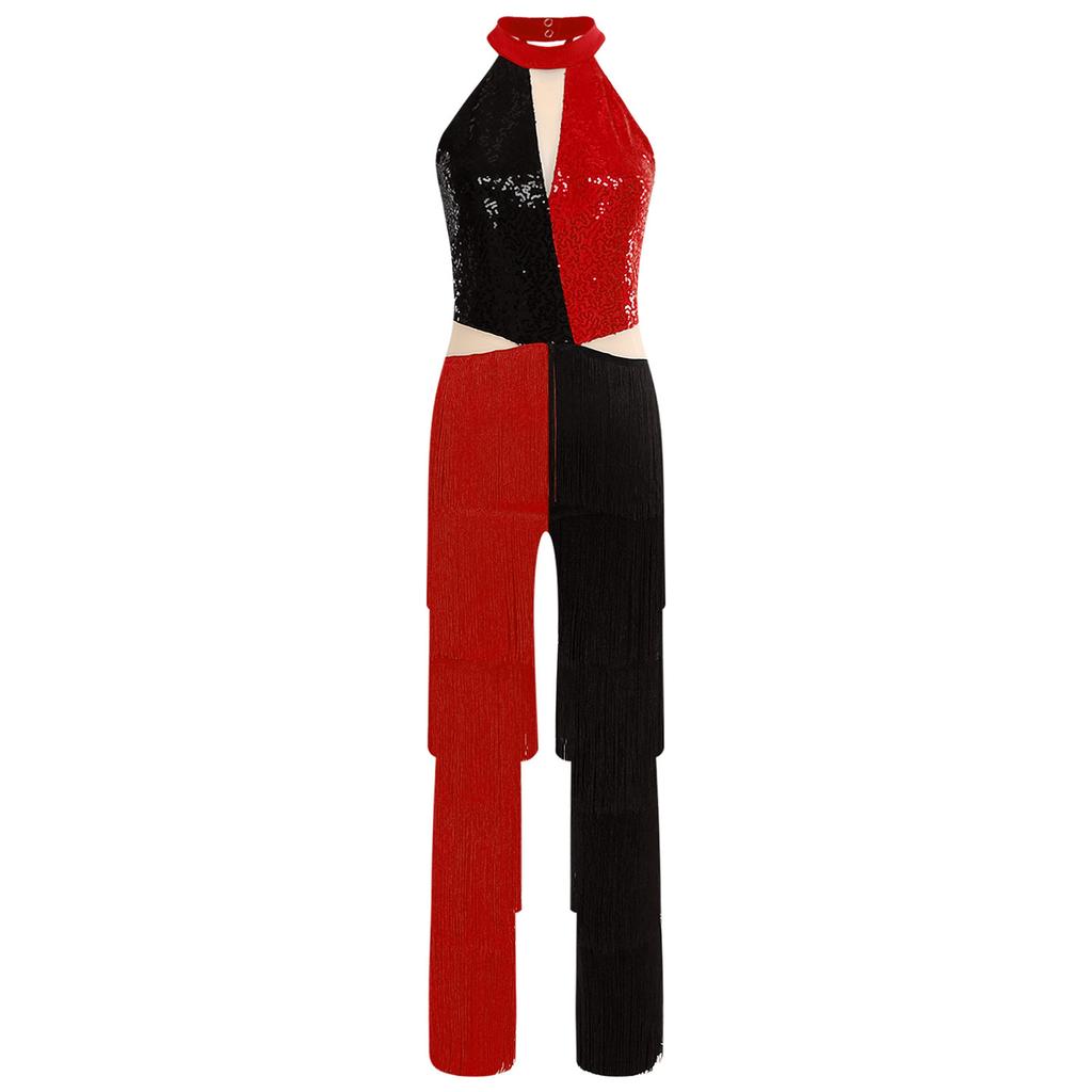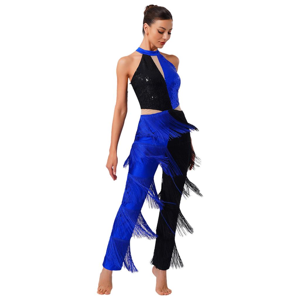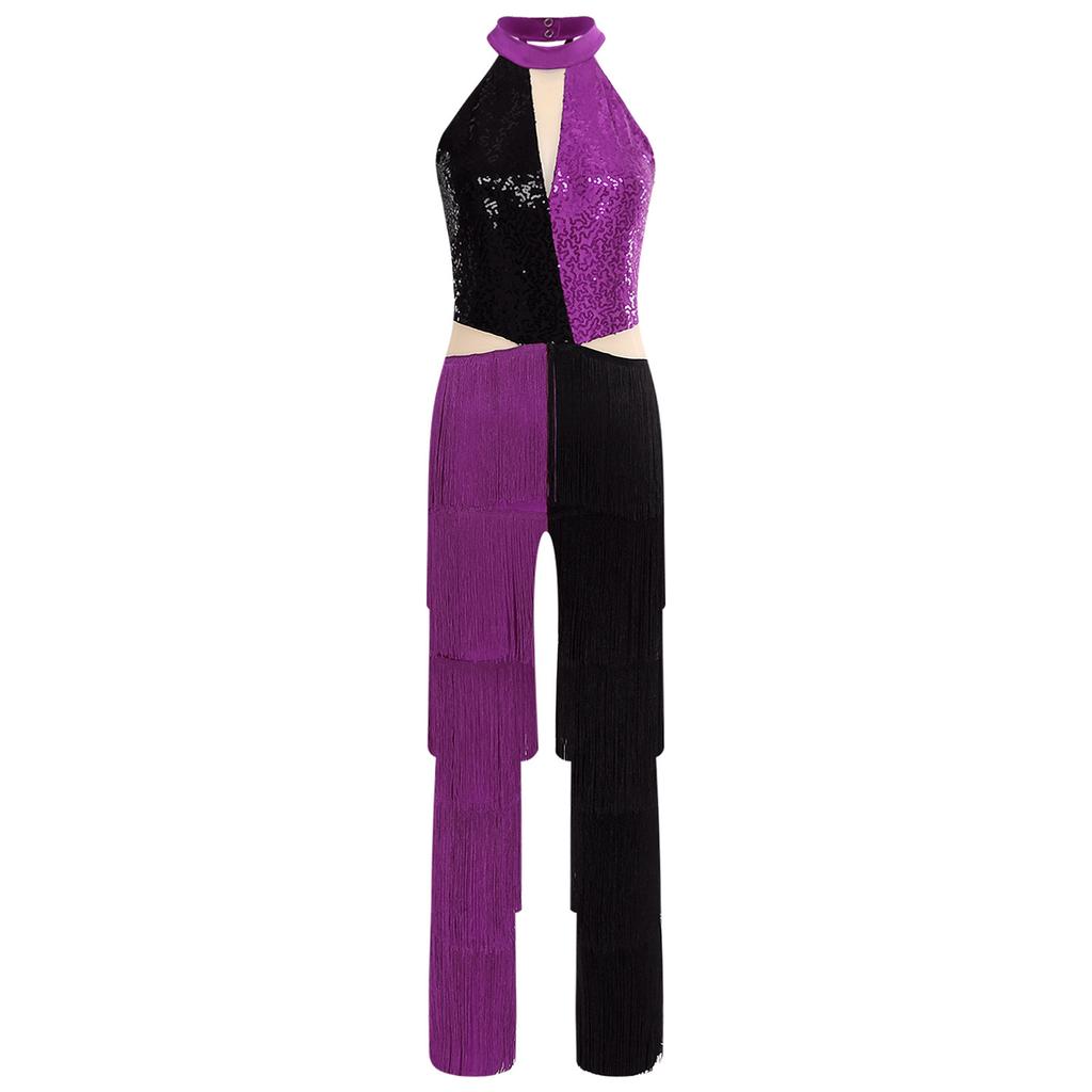 Женский диско-комбинезон 70-х годов, блестящий, с пайетками, с кисточками на груди, с бахромой, длинные брюки, контрастная расцветка, цельный боди, клубная танцевальная одежда
