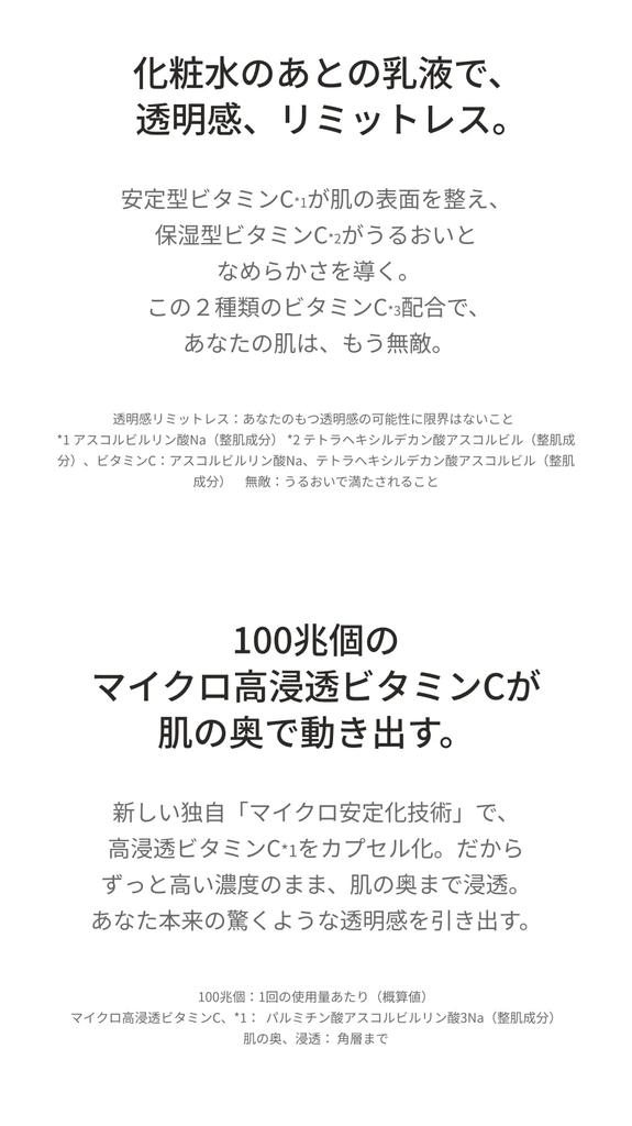 [Эмульсия, вдохновленная передовой косметической дерматологией, для еще более сияющей кожи] Более 100 триллионов*1 микро-высокопроникающего*2 витамина С (ПРОГРАММЫ)*1 быстро проникает глубоко в кожу*2. Он быстро проникает*2 в кожу, начинающую проявлять изменения.. Для тусклости*3, неровной текстуры, расширенных пор*4 и сухости.