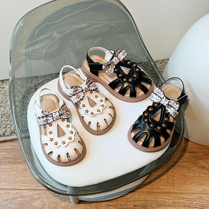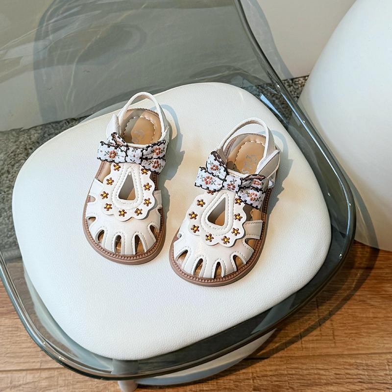 Босоножки для девочек с перфорацией, нескользящие, детская пляжная обувь, украшенные милыми бантиками, вышитые, новинка 2025 года, туфли принцессы для девочек на лето, мягкая подошва