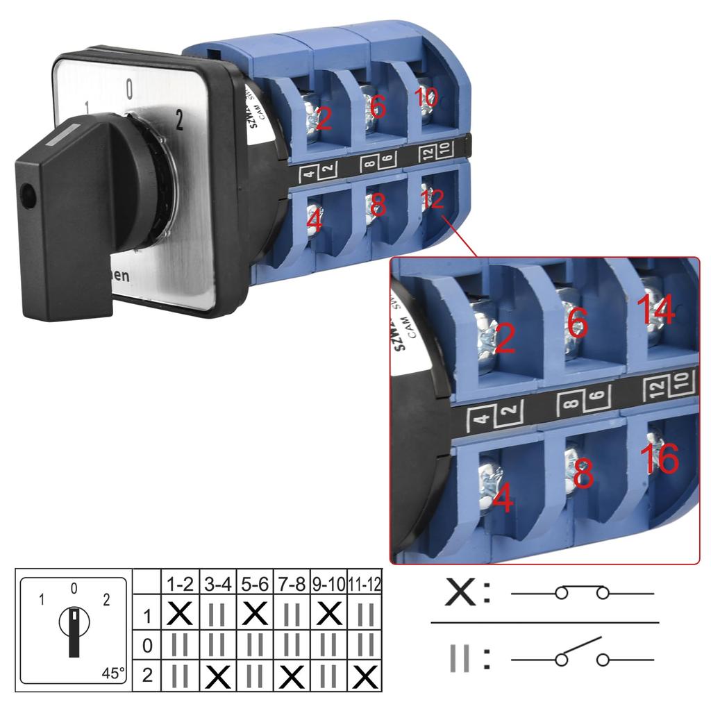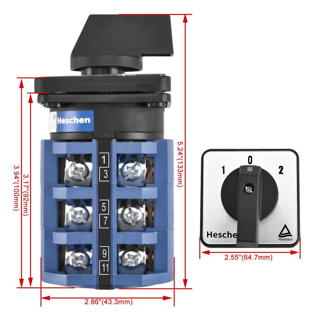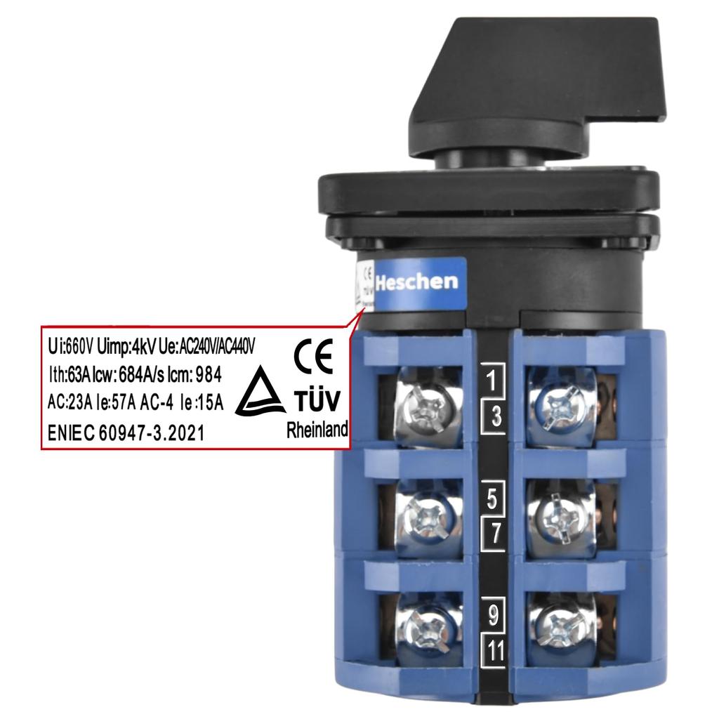 Heschen Универсальный поворотный кулачковый переключатель 660 В CE, SZW26-63/D303.3, 63 А, 3 положения ВКЛ-ВЫКЛ-ВКЛ, 3-фазный 12-контактный,
