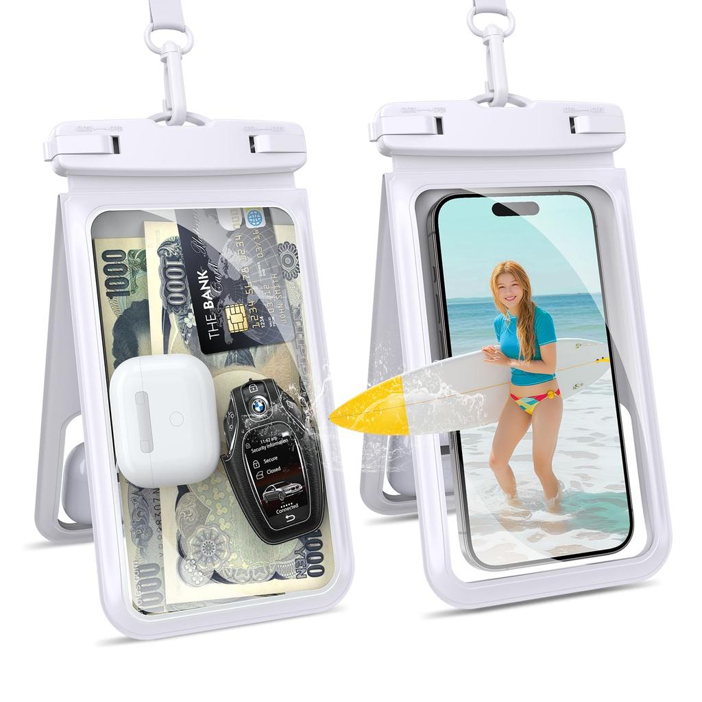 Водонепроницаемый чехол для смартфона MINSLIS (Набор из 2 штук, Полностью водонепроницаемый), IPX8 Водонепроницаемый, Совместимый с сенсорным управлением под водой, Двойное хранилище, Хранение мелких предметов, Двойные карманы, Совместимый с ванной/морем/бассейном/горячим источником, Экран с высокой светопропускной способностью, Распознавание лица, Освобождающий руки, Ремешок в комплекте, для iPhone/Android, Идеально подходит для игр в снегу, катания на лыжах, пеших походов и рыбалки (белый)