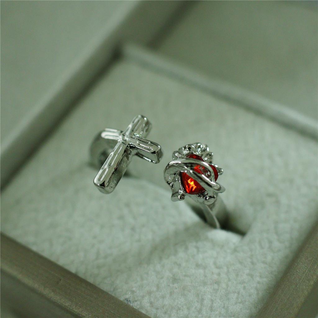 Красиво выполненное разомкнутое кольцо с изображением Святейшего Сердца Иисуса, украшенное креативным терновым красным сердцем из искусственного кристалла.