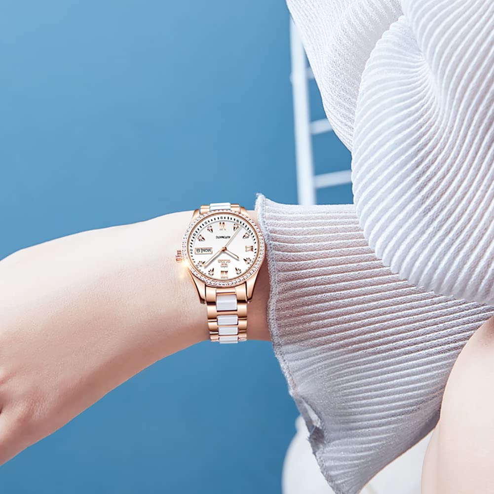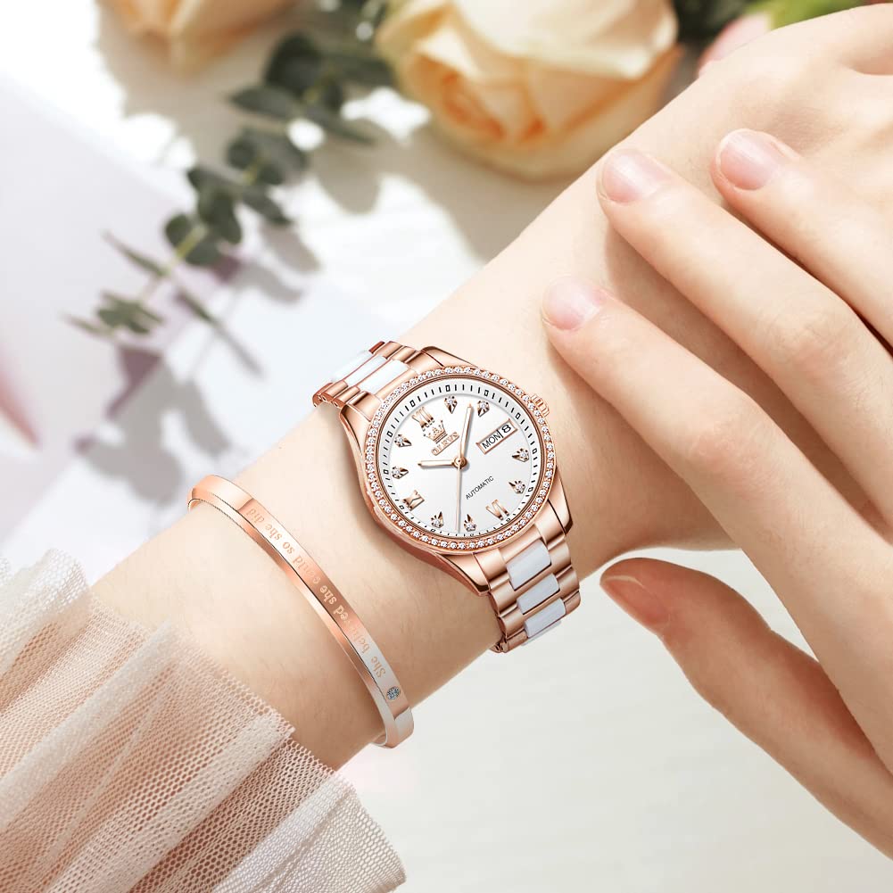 OLEVS Популярные и водонепроницаемые механические часы с датой, люминесцентные и керамические белые женские наручные часы, стильные, дисплей, циферблат, браслет,