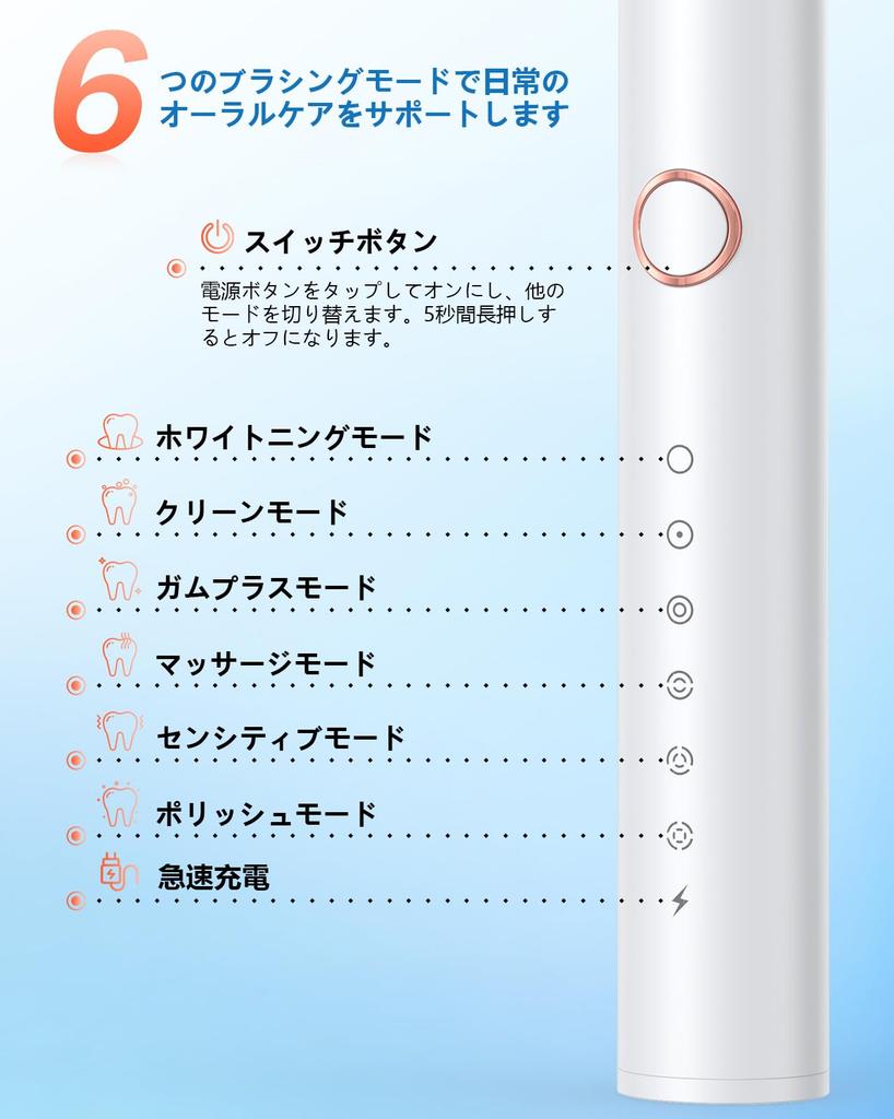 【Пять высокоэффективных режимов электрической чистки зубов】Мы предлагаем шесть специальных режимов электрической чистки зубов: Режим отбеливания, Режим чистки, Режим Gum Plus, Режим массажа, Чувствительный режим и Режим полировки. Эти режимы подобраны для отдельных зубов и ситуаций, позволяя вам выбрать наиболее подходящий режим чистки зубов.