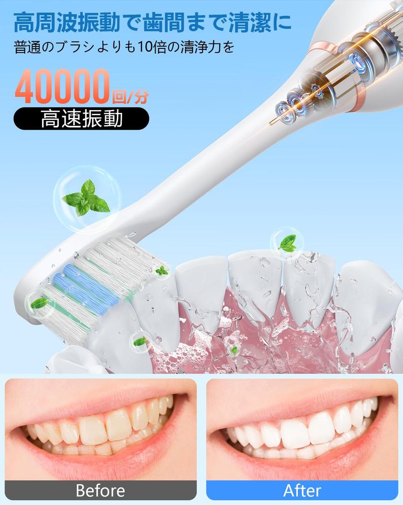 [Высокоскоростная звуковая технология очистки]: 200 000 раз в минуту] Эргономичный дизайн и легкий вес, примерно 86 г, тонкий дизайн, который удобно держать в руке, делает его простым в использовании как для начинающих, так и для опытных пользователей.. Аккуратно приложите щетку к зубам и тщательно почистите рот всего за две минуты, независимо от возраста или пола.. Оснащенный высокотехнологичным двигателем на магнитной левитации, высокоскоростные ультразвуковые вибрации удаляют зубной налет более чем в 10 раз эффективнее, чем мануальные зубные щетки.. В то же время ультразвуковые вибрации циркулируют влагу во рту, эффективно очищая грязь между зубами.. Мощная чистящая сила удаляет грязь и предотвращает образование зубного камня, а мягкая щетина эффективно удаляет грязь с задних зубов и между зубами, областей, которых не могут достичь даже продукты крупных производителей.