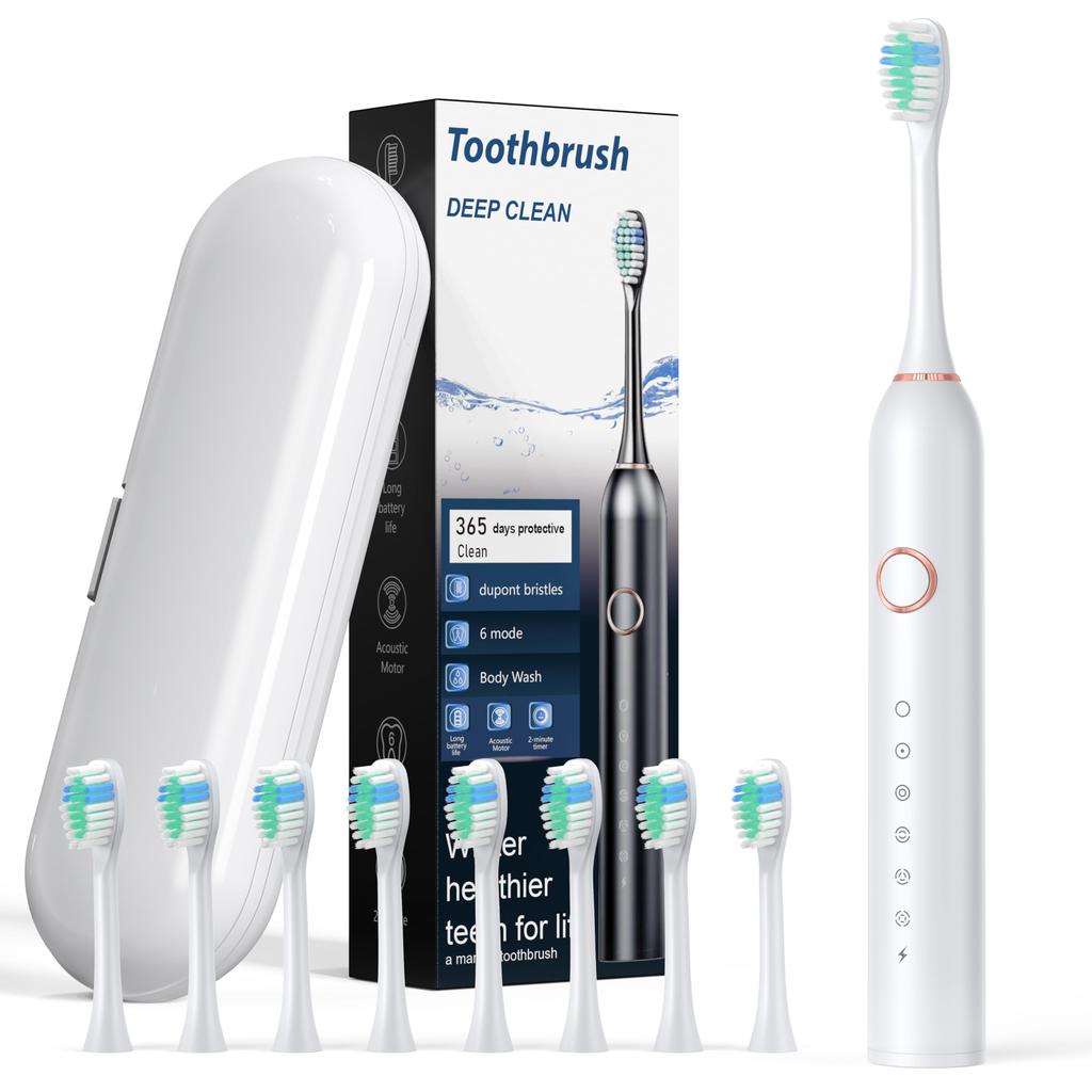 Звуковая электрическая зубная щетка с боковым качанием, водонепроницаемая IPX7, 6 режимов, 8 сменных насадок, перезаряжаемая через Type-C, 50 дней непрерывного использования, 2-минутный автотаймер, чехол для хранения в комплекте, низкий уровень шума, портативная, удобная для путешествий, модель 02