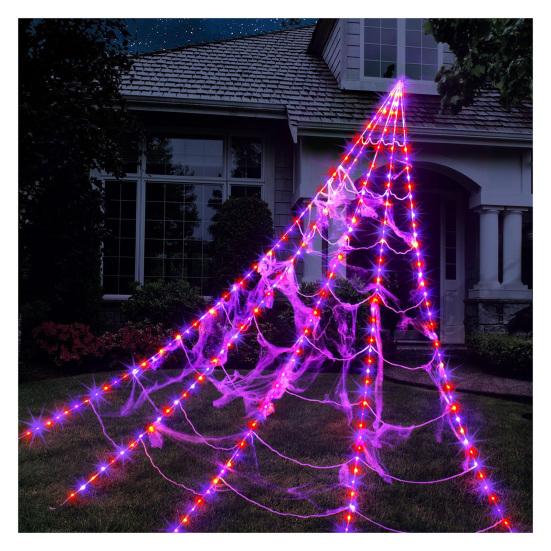 Большие паутины украшены уличными декорациями, которые освещают всю территорию, создавая жуткую атмосферу.. Используйте пульт дистанционного управления для переключения между различными режимами освещения для дополнительной универсальности.