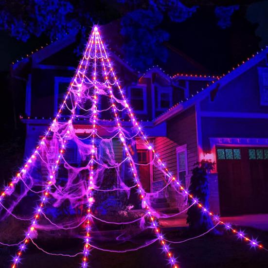 Привлекательная подсветка: Преобразите свое пространство нашими праздничными украшениями - огромными паутинами, украшенными уличными декорациями, которые ярко освещают ночь.. Режимы освещения с дистанционным управлением обеспечивают универсальность, гарантируя, что ваш двор будет сиять как центральный элемент в ночь Хэллоуина.