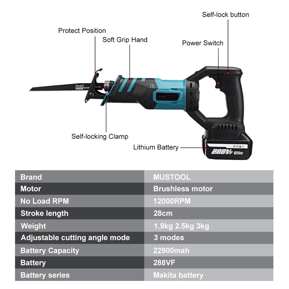 2400 Вт Бесщеточная электрическая сабельная пила Регулируемые 3 режима ориентации Пила для резки Портативный аккумуляторный ручной электроинструмент