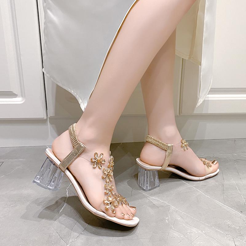 Лето 2024 года, новые босоножки на высоком каблуке, женский стиль, мода, небольшой цветочный декор, пряжка, прозрачный квадратный каблук, женская обувь