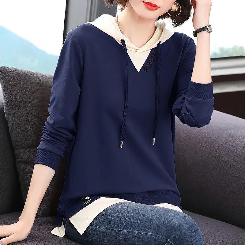 Женская Мода Повседневная Однотонная Сращенная Толстовка с Капюшоном Осень Повседневность Простота Имитация Двойки Топы Женская Одежда A794