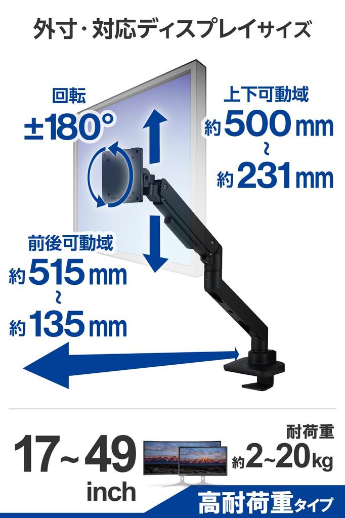 ELECOM Monitor Arm Compatible with Widescreen Monitors Weight Capacity Mounting Bracket Articulation DPA-SS11BK, (17-49 inches), 2kg-20kg,
