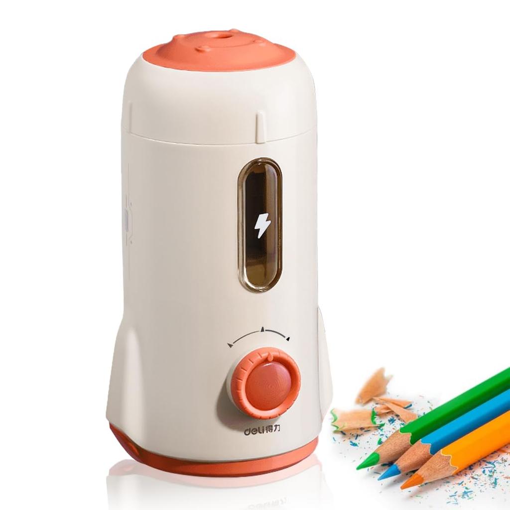 Это полностью автоматическая аккумуляторная точилка для карандашей. Просто вставьте карандаш прямо в точилку, и она автоматически подхватит карандаш, начнет вращаться и точить его.. Он чувствительный, и после заточки автоматически выбрасывается. Просто отпусти.. Вы даже можете позволить своему ребенку точить карандаш. Его невероятно долгий срок службы позволяет ему работать до целого семестра на одном заряде.. Прочное спиральное лезвие изготовлено из сплава вольфрамовой стали и может использоваться более 15 000 раз, обеспечивая исключительную долговечность.. Милая вертикальная точилка в научно-фантастическом стиле занимает очень мало места, как небольшой космический корабль, что делает ее идеальной для маленького школьного стола или для того, чтобы легко поместить ее в сумку ребенка.. Поверьте нам, ваш ребенок не откажется от такого милого аксессуара.