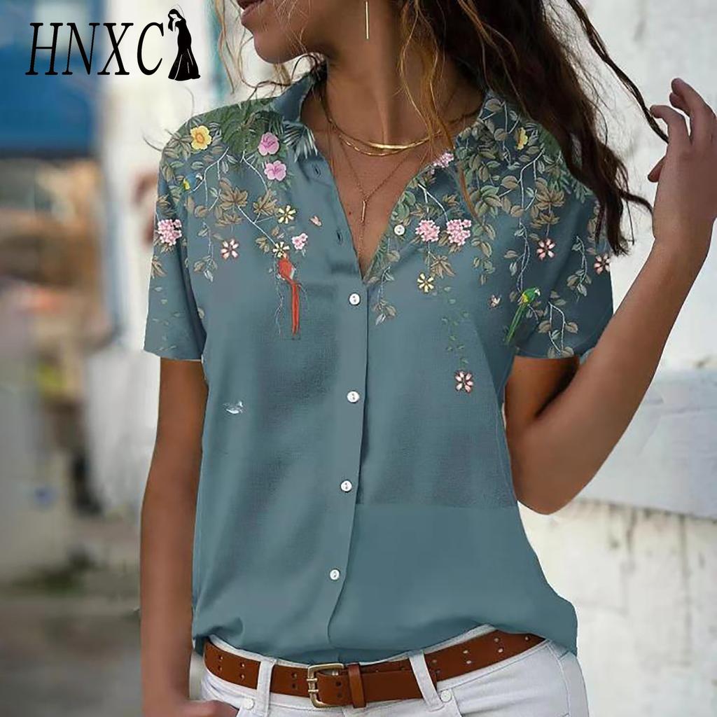 Летняя женская одежда больших размеров HNXC: Свободная шифоновая блузка с коротким рукавом и принтом, топ с расклешенными рукавами для женщин — купить товар онлайн с бесплатной доставкой по всему миру!
