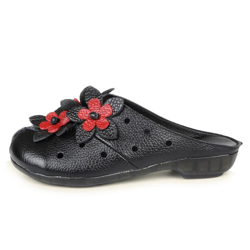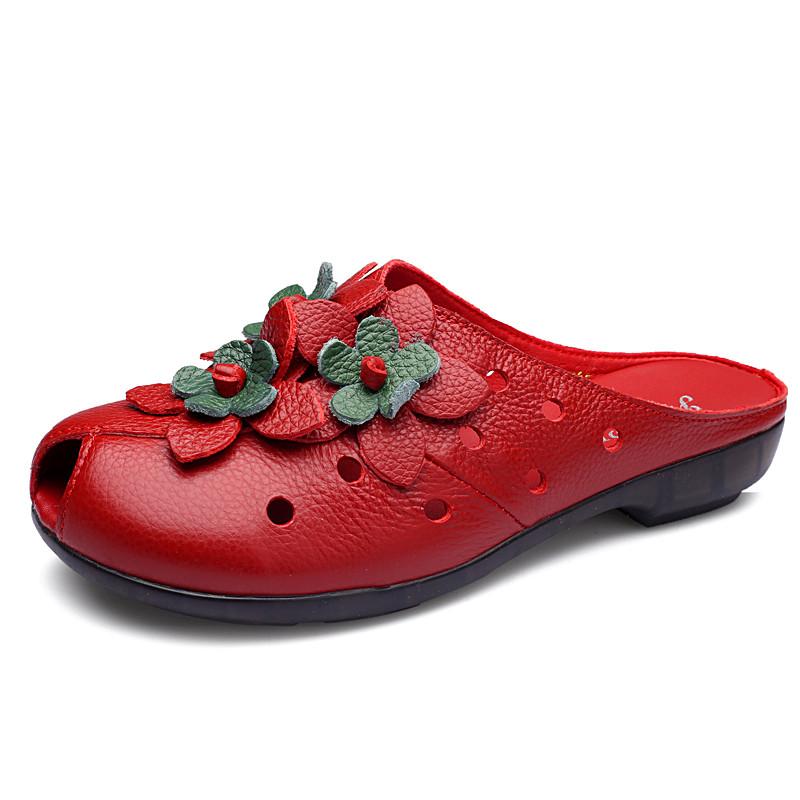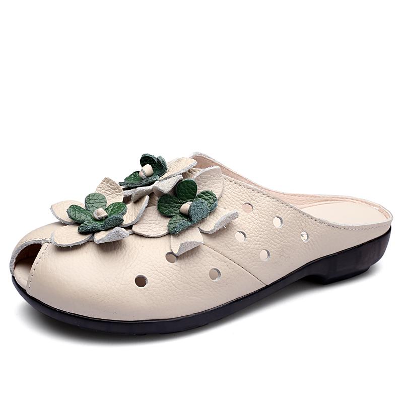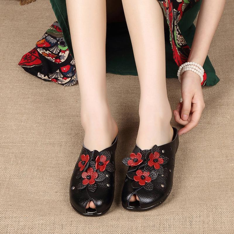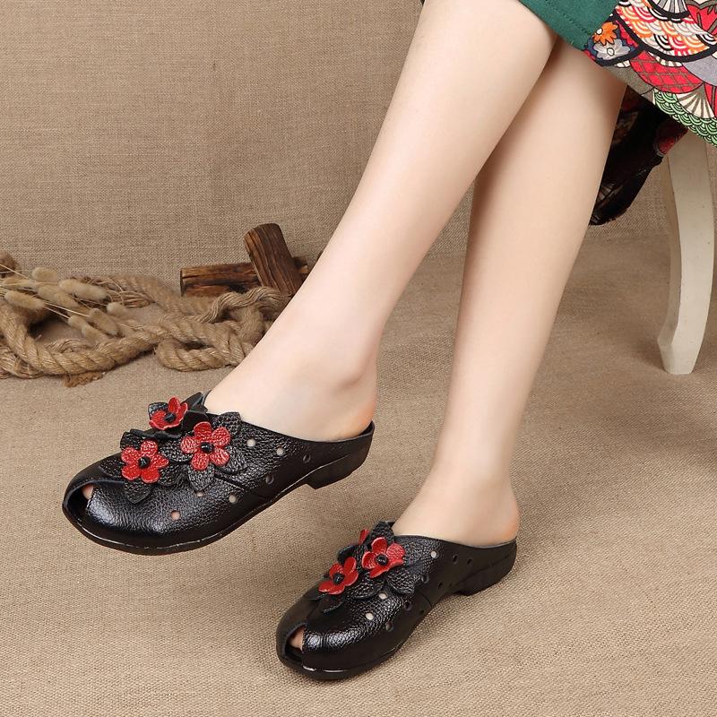 Летняя мода Женская обувь Сандалии из натуральной кожи Шлепанцы Ретро цветы Закрытый носок Женские лоферы Балетки Обувь Sandalias WSH3366