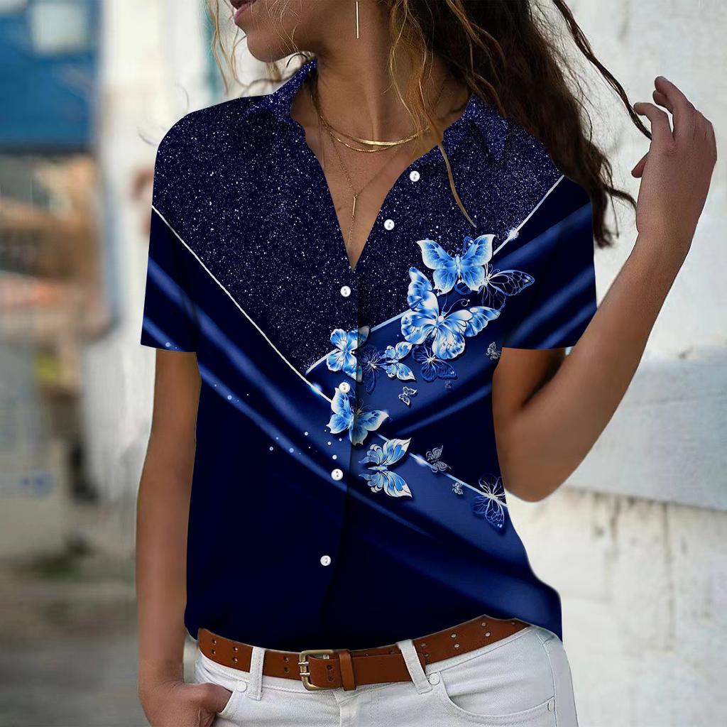 2025 Лето Новая Мода Женская Повседневная Рубашка Топ с Коротким Рукавом и V-образным Вырезом на Пуговицах с Принтом Бабочек — купить товар онлайн с бесплатной доставкой по всему миру!