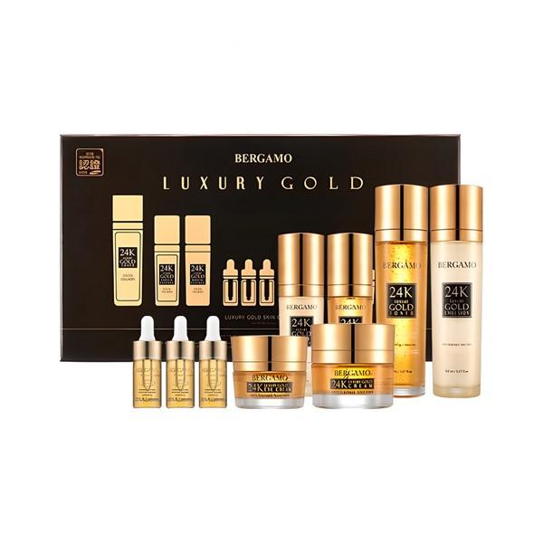Bergamo Настоящее 24-каратное золото Набор из 9 предметов (Тонер 150 мл + Эмульсия 150 мл + Эссенция 50 мл + Эссенция 50 мл + Крем 50 г + Крем для век 30 г + (Ампула 13 мл * 3))