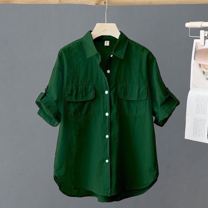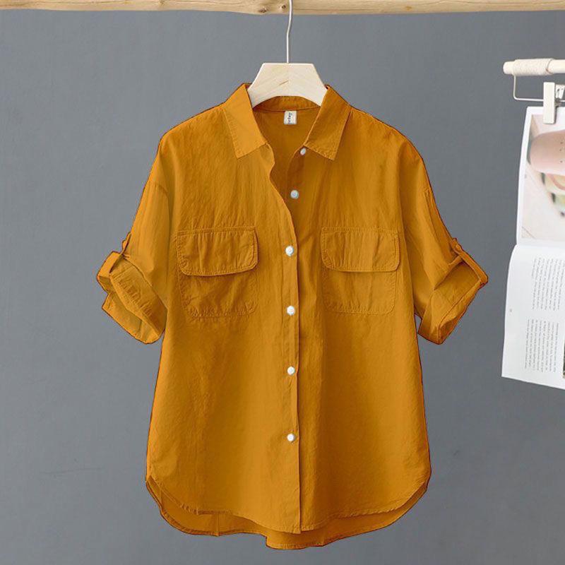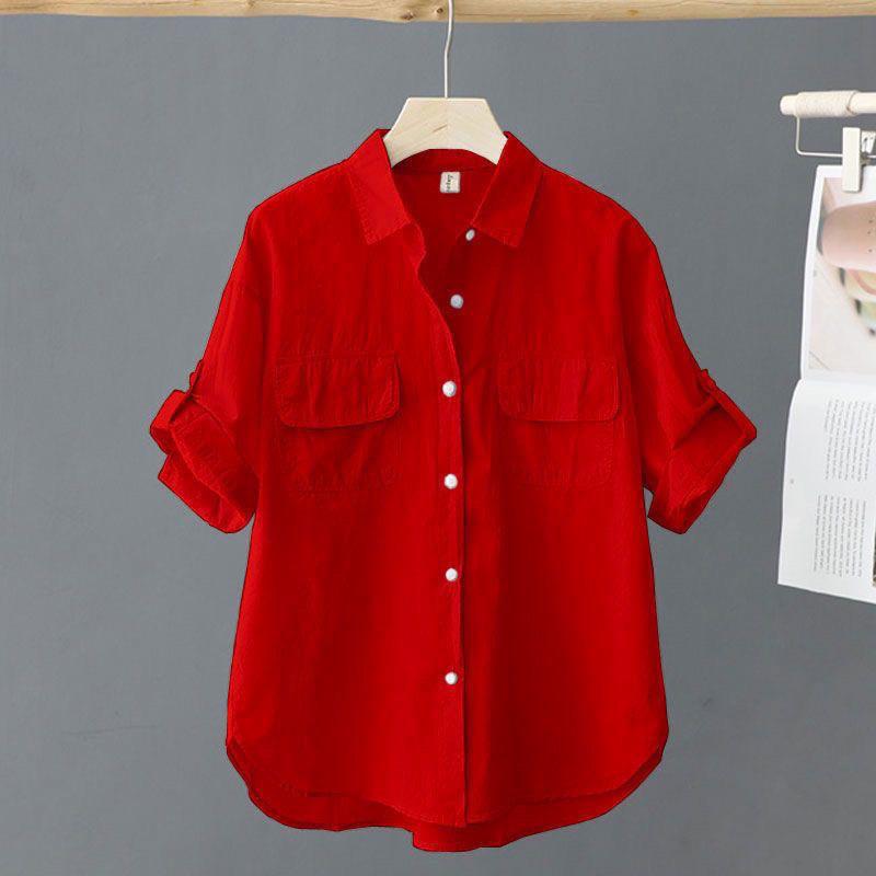 Отложной воротник, розовая однотонная свободная рубашка с короткими рукавами и блузка, повседневная однобортная весенняя простая верхняя одежда OL