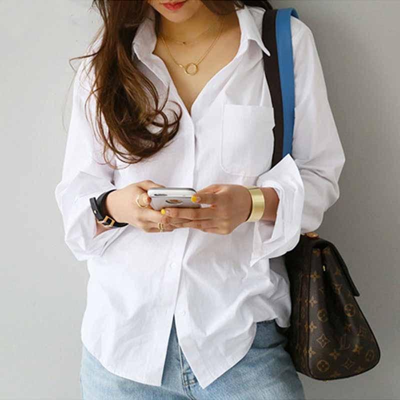 Белые женские рубашки и блузки Повседневная мода Отложной воротник OL Стиль Корейский Офис Топы с длинным рукавом Свободные блузки