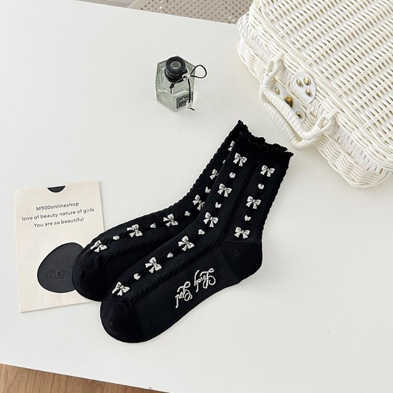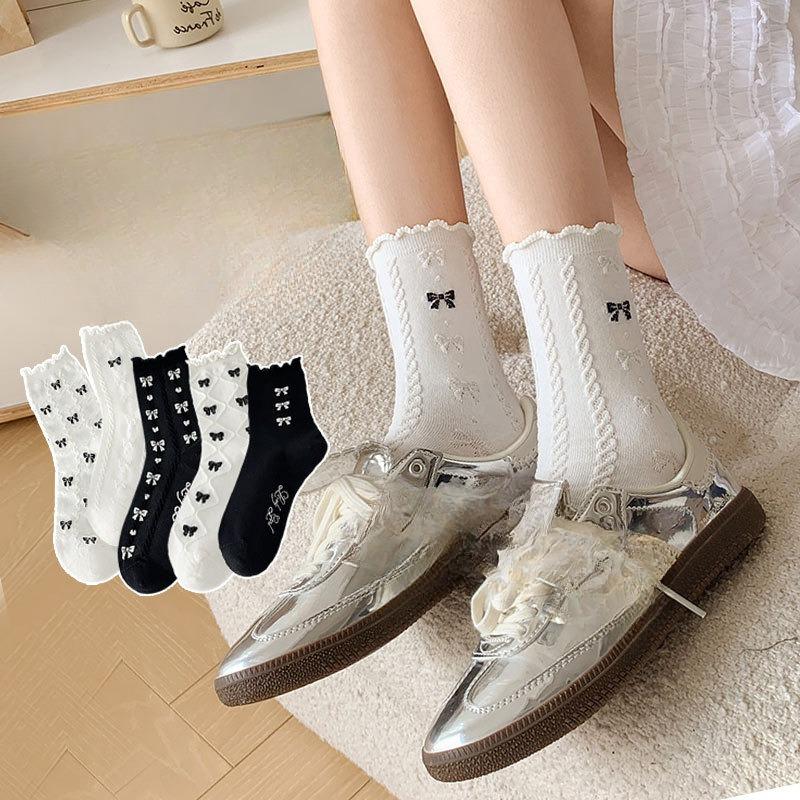 Женские носки до середины икры, осенне-зимние кружевные женские носки, универсальные хлопковые носки с бантом, черные и белые носки до икры с отделкой ушками