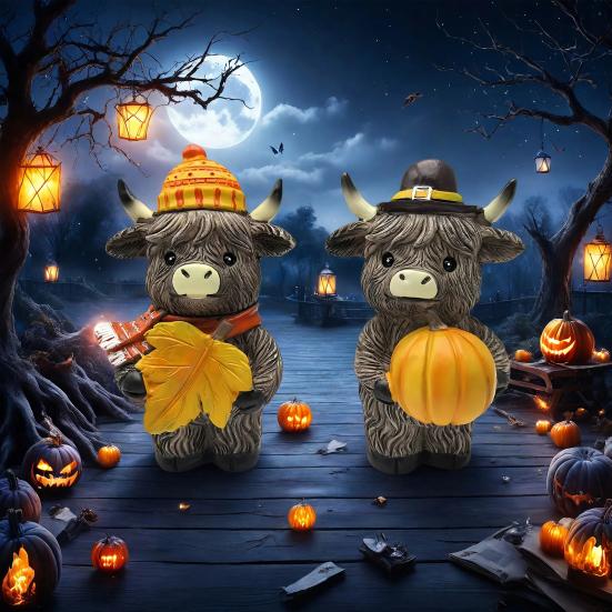 Праздничный дизайн изображает шотландскую корову в шляпе волшебника и желтом шарфе, держащую метлу, а также другую корову в шляпе скелета с тыквой на Хэллоуин.. Этот набор, изготовленный из прочной смолы, является водонепроницаемым и устойчивым к растрескиванию или деформации..