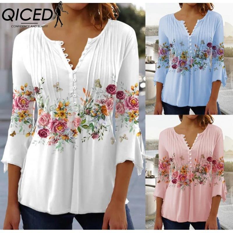 QICED Весенне-летняя мода Женская одежда Цветочный принт V-образный вырез Короткий рукав Плиссированная Пуговичная футболка Базовый слой — купить товар онлайн с бесплатной доставкой по всему миру!