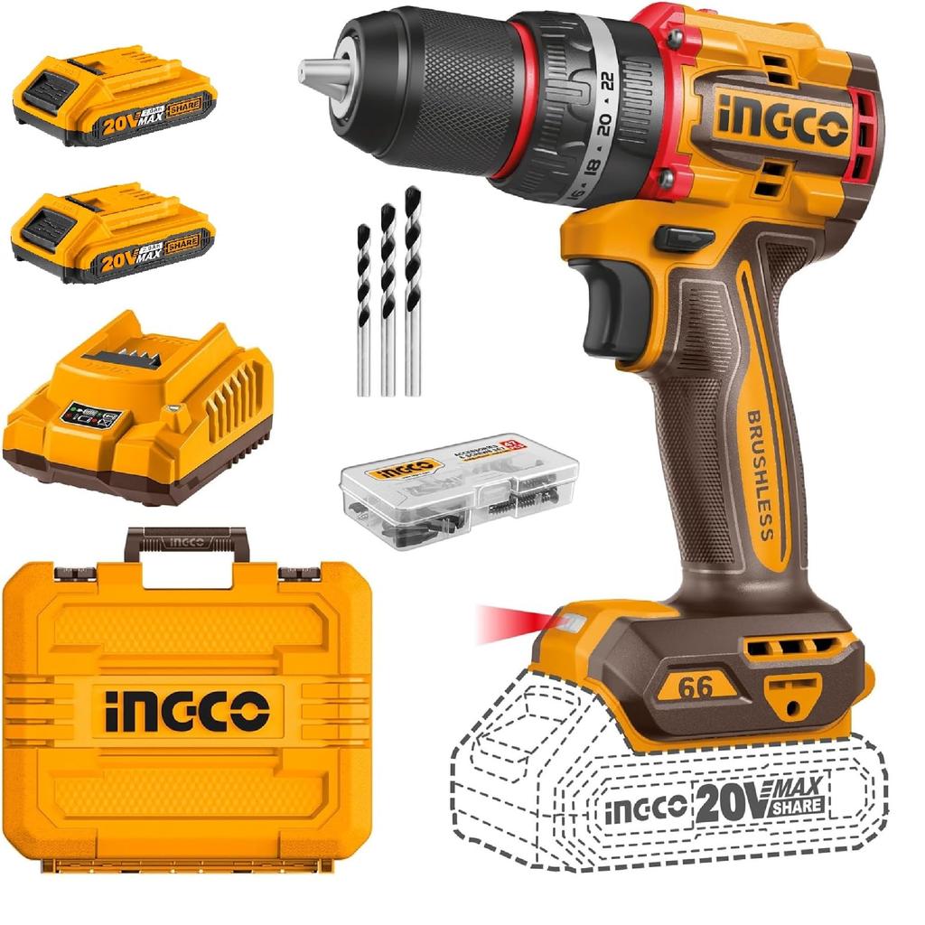 наименование товара: Бесщеточная ударная дрель INGCO 20 В с крутящим моментом 66 Нм 2 аккумулятора по 2,0 Ач и зарядное устройство