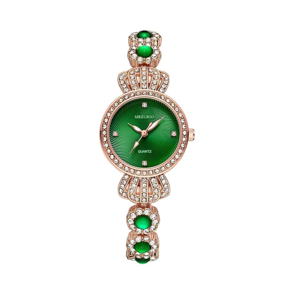 Регулируемый Комфорт и Стиль: Материал: искусственная кожа/сплав/латунь/хрустальное стекло/нержавеющая сталь/полиуретановый ремешок, обеспечивающий идеальную посадку на запястье любого размера, сохраняя при этом элегантный, современный вид.