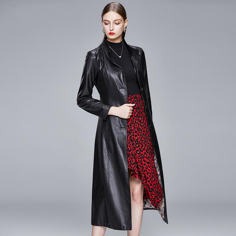 Женский ремень Длинный рукав Однобортный Роскошная мода Весна Осень Длинное черное Мягкое Водонепроницаемое Пальто из искусственной кожи
