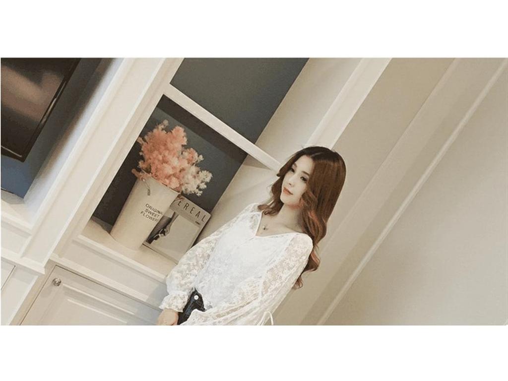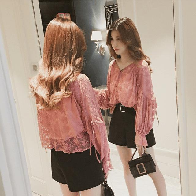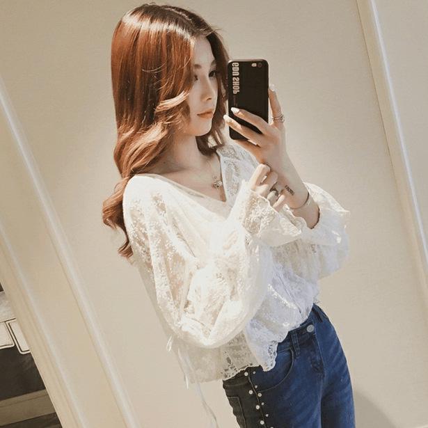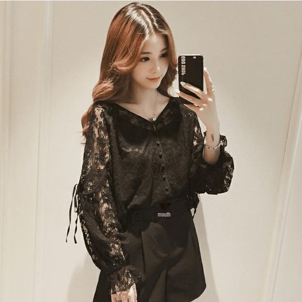 Кружевная блузка с V-образным вырезом в корейском стиле - Женская с длинным рукавом, милая, свободного кроя для весны/осени 2025 года.