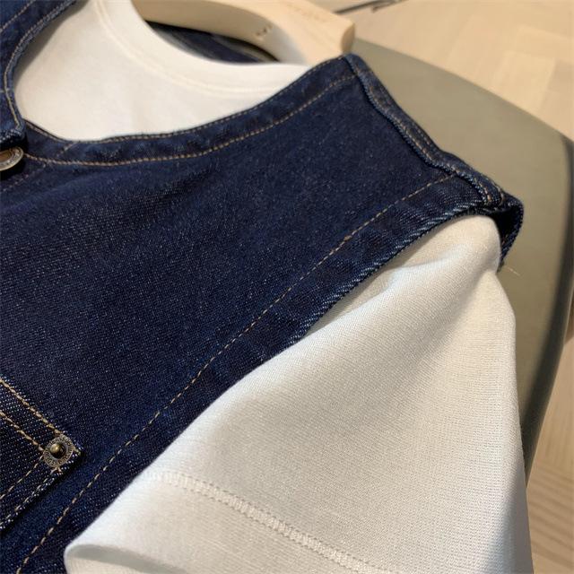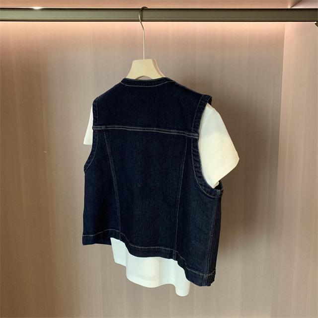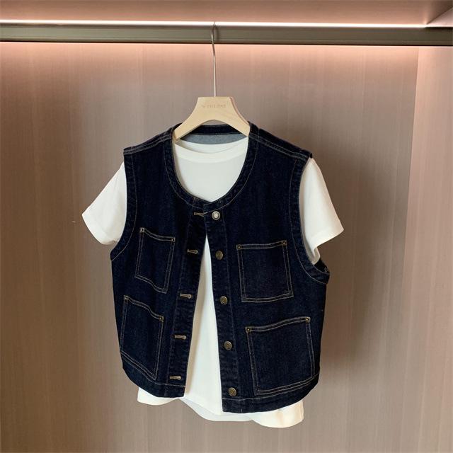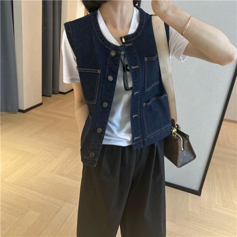 Джинсовый жилет в корейском стиле, ретро, темно-синий, с круглым вырезом - женская маленькая одежда без рукавов для весны и осени
