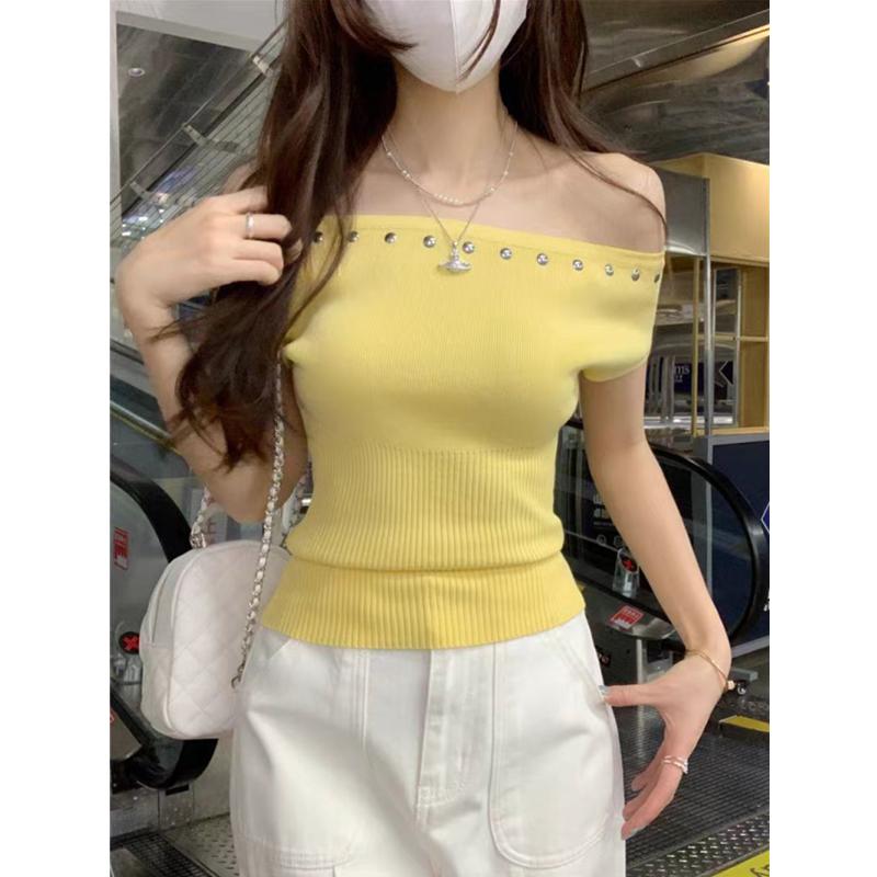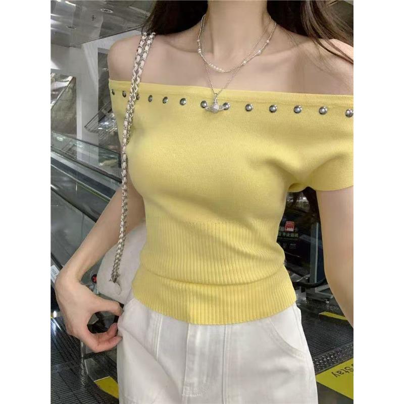 Модный свитер с открытыми плечами, с коротким рукавом, элегантный, с заклепками, вязаный, женская блузка, облегающий, простой пуловер, однотонная футболка, Y2k, повседневный топ, одежда