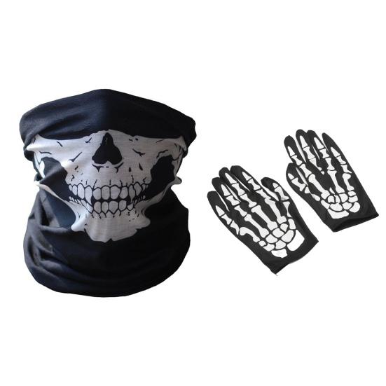 Представляем наш набор перчаток-маски с черепом, идеальный аксессуар для завершения вашего жуткого костюма на Хэллоуин! Этот набор включает в себя маску и перчатки с реалистичным жутким рисунком черепа, добавляя таинственную и праздничную атмосферу любой вечеринке-переодеванию. Изготовленные из удобных и цветостойких хлопчатобумажных и полиэфирных материалов, маска и перчатки подходят всем под один размер и легко адаптируются к разным размерам головы и рук благодаря эластичному материалу. Они не только согревают ваше лицо, уши и шею в качестве защиты от ветра, но также служат нескольким целям - используйте их в качестве банданы, шарфа, шляпы, повязки на голову, браслета, вкладыша для шлема, шейного шарфа, пылезащитного экрана или резинки для волос. Универсальность этого набора делает его уникальным подарком для маскарадных вечеринок на Хэллоуин или костюмированных вечеринок. Мгновенно превратитесь в жуткий скелет и привлеките внимание, куда бы вы ни пошли. Добавьте больше праздничной атмосферы на Хэллоуин в свой костюм с помощью нашего набора перчаток для маски черепа и выделитесь из толпы!