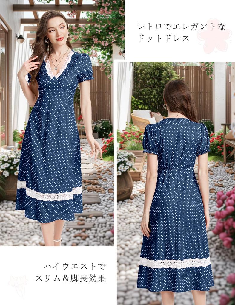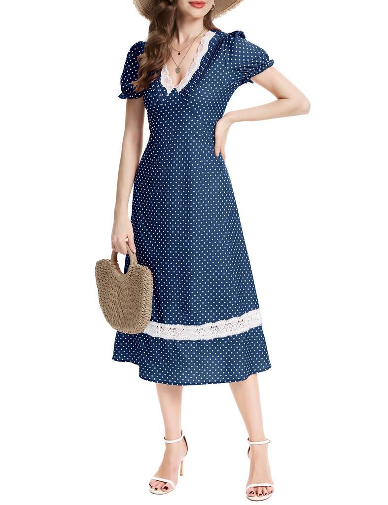 Dresstel Платье миди с коротким рукавом в горошек для вишни и темно-синего цвета, размер L, женское, с завышенной талией, V-образным вырезом, для свадеб, курортов, гостей, просмотра, свиданий,