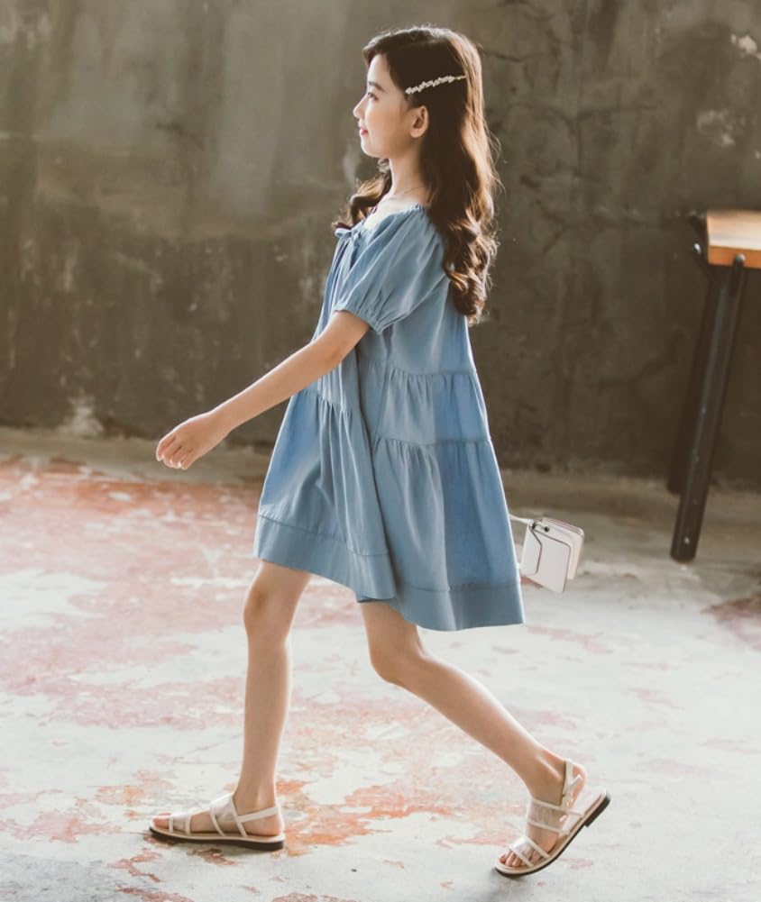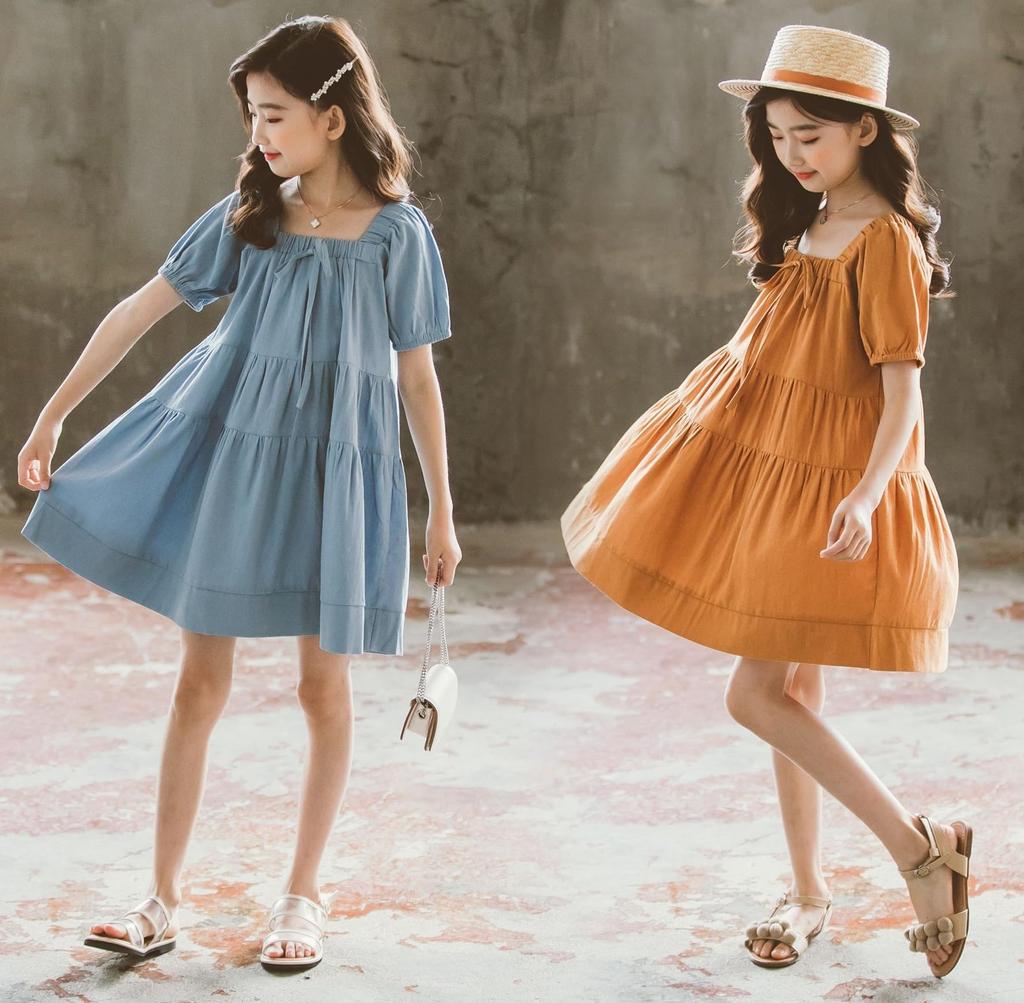 Beveaya Летнее платье с коротким рукавом, расклешенное, свободное, летнее, однотонное, идеально для повседневной носки, размер 160, платье для девочек, А-силуэт, приталенное, с лентой, детское платье, милое, цветное, для носки,