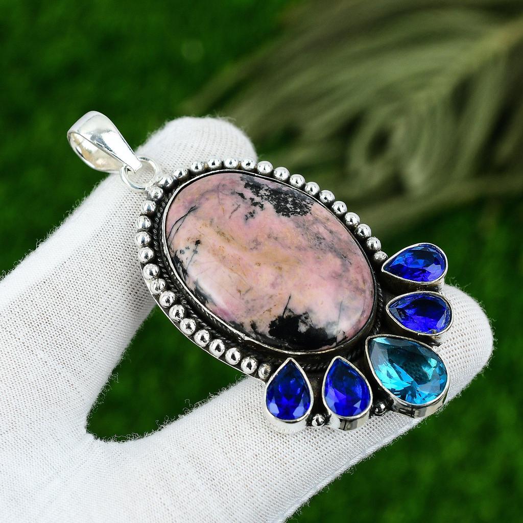 Подвеска из натурального родонита розового цвета, серебро 925 пробы, индийские украшения