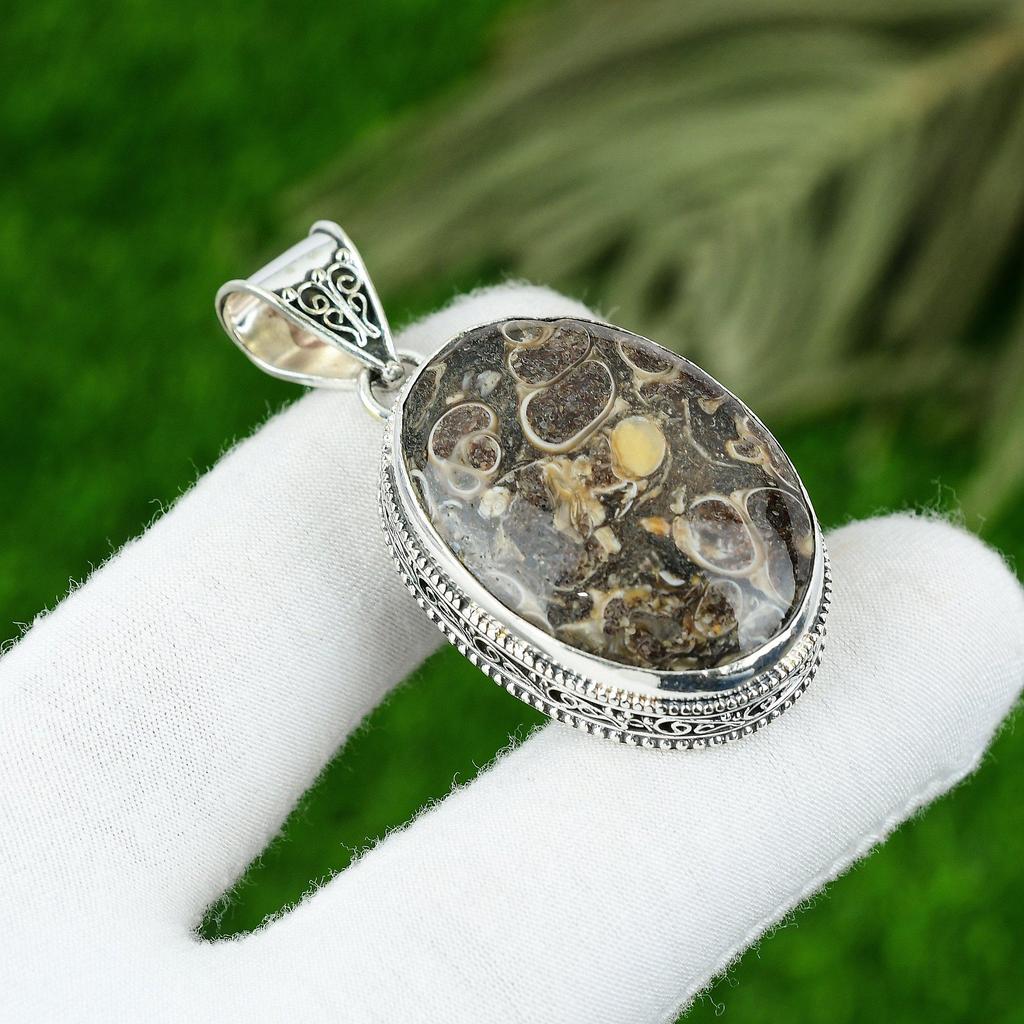 925 Silver Natural Turritella Agate Art Deco Vintage Birthday Pendant Jewelry
