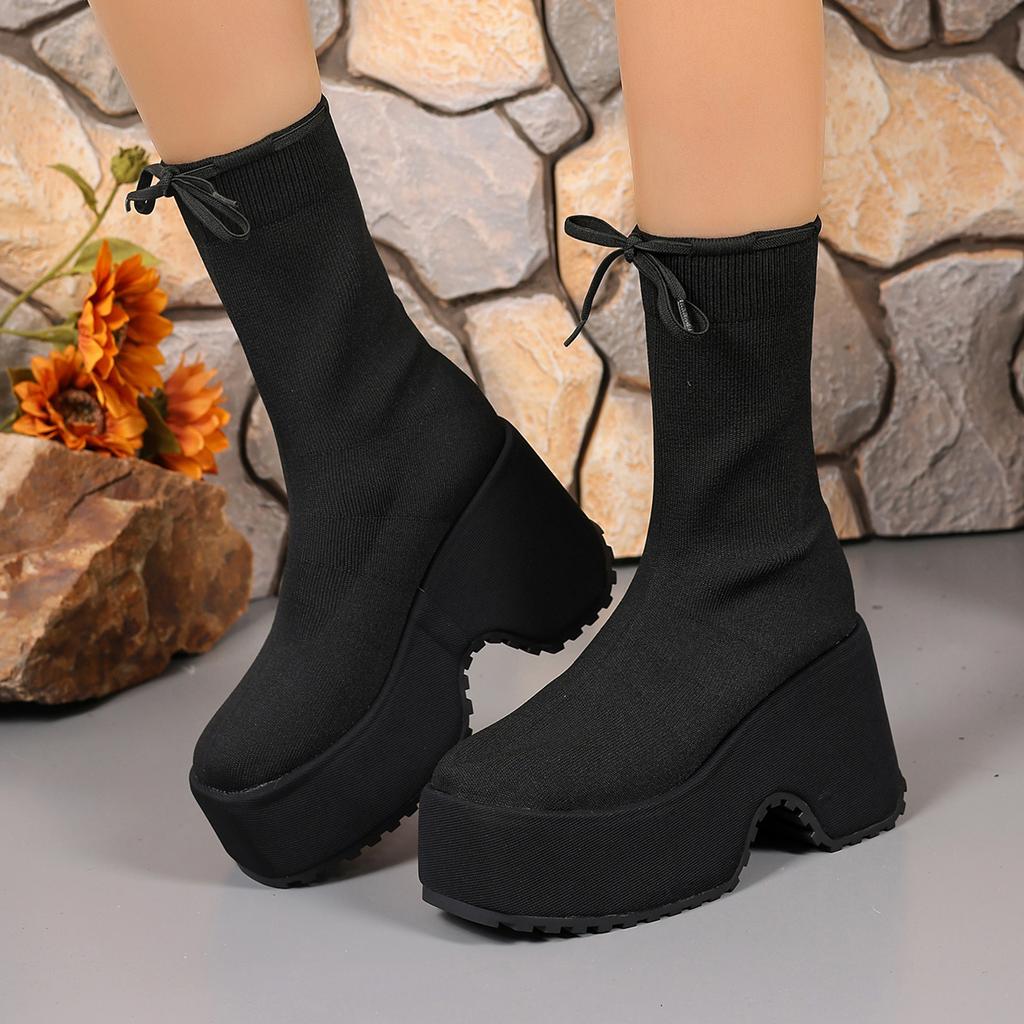 Тренд 2025 Женские Новые Челси Туфли Платформа Женские Вязаные Ботильоны-носки до щиколотки Мода Зимние Снежные Боты Женские Обувь на Высоком Каблуке с Бантом