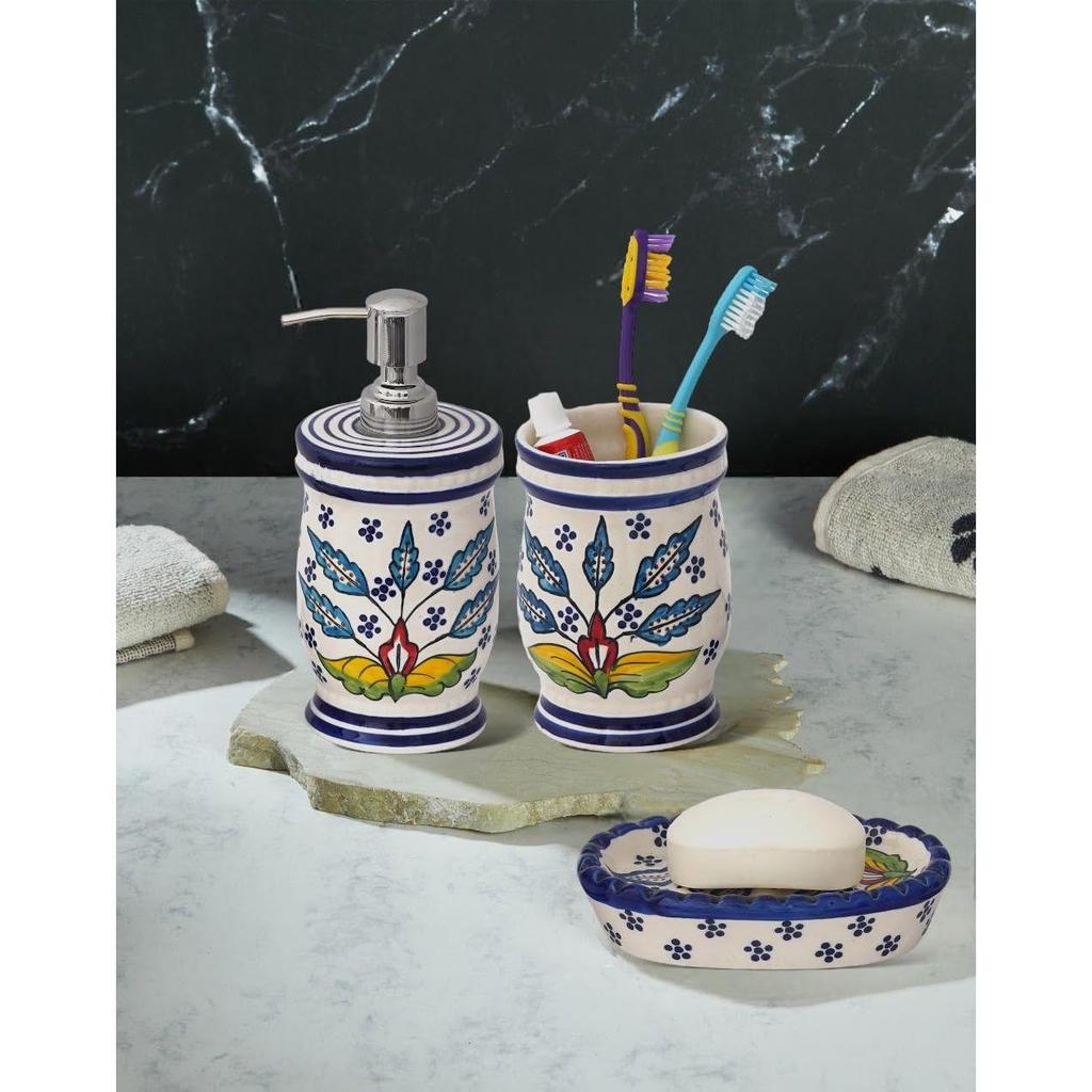 Премиальный керамический набор аксессуаров для ванной из 3 предметов | Современный набор для ванной ручной росписи с дозатором для мыла 300 мл, подставкой для зубных щеток и мыльницей | Предметы домашнего декора | Многоцветный цветочный дизайн