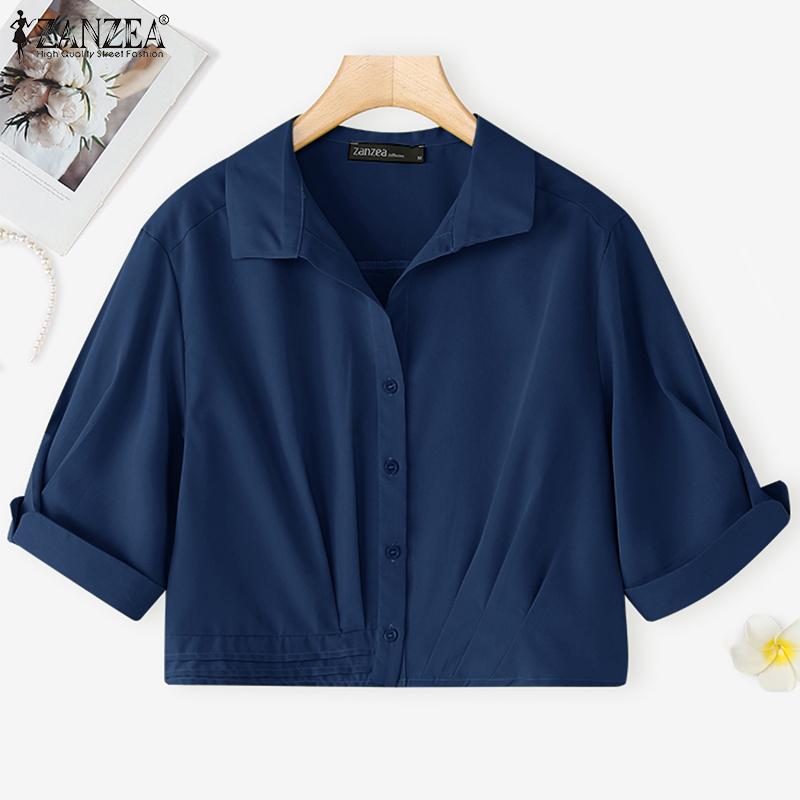 ZANZEA Женская блузка с лацканами, короткими рукавами, пуговицами, повседневная, укороченная