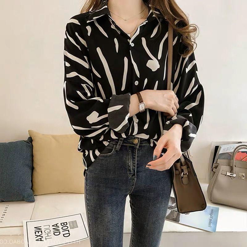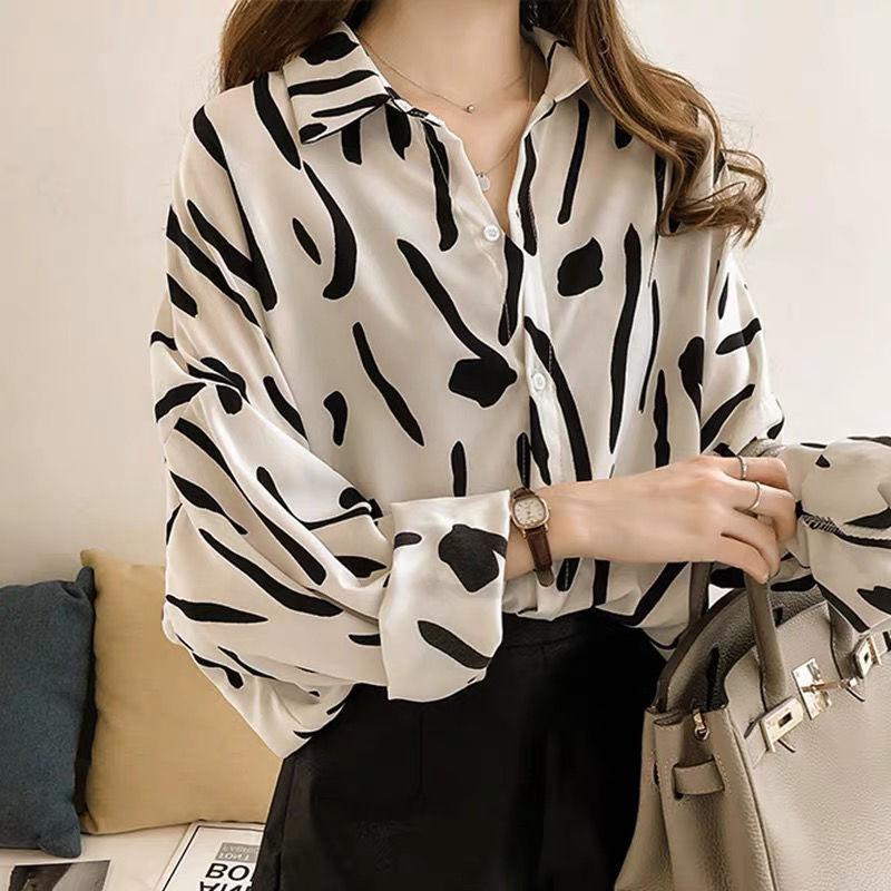 Большие размеры Женская рубашка Ulzzang с принтом, длинный рукав, свободная блузка, повседневные тонкие пуговицы, корейские блузки, рубашки больших размеров