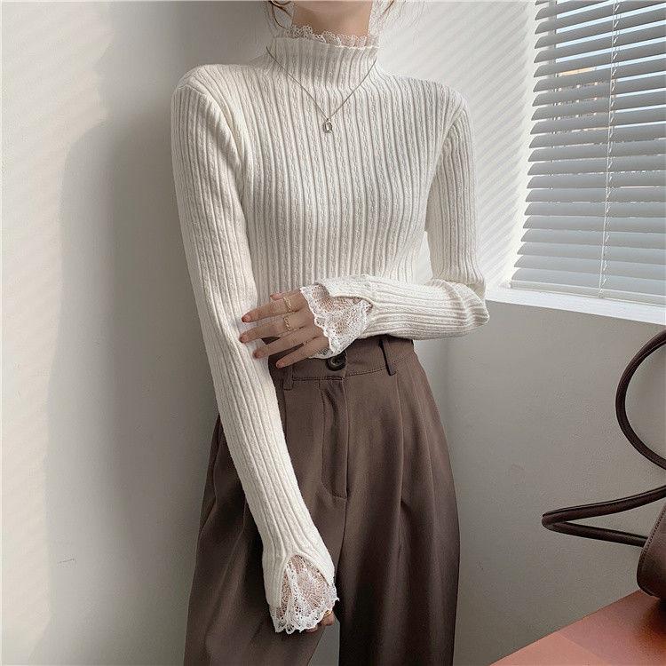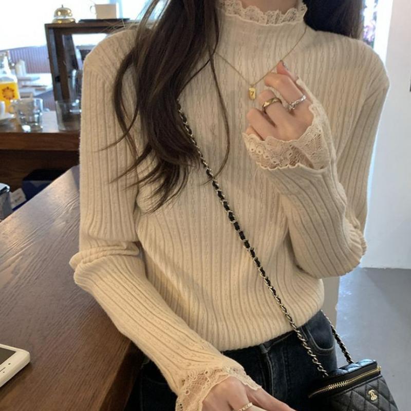 Женский базовый слой с кружевной отделкой Осень Весна Водолазка Приталенный Элегантный свитер Абрикосовый Трикотажный топ с длинным рукавом