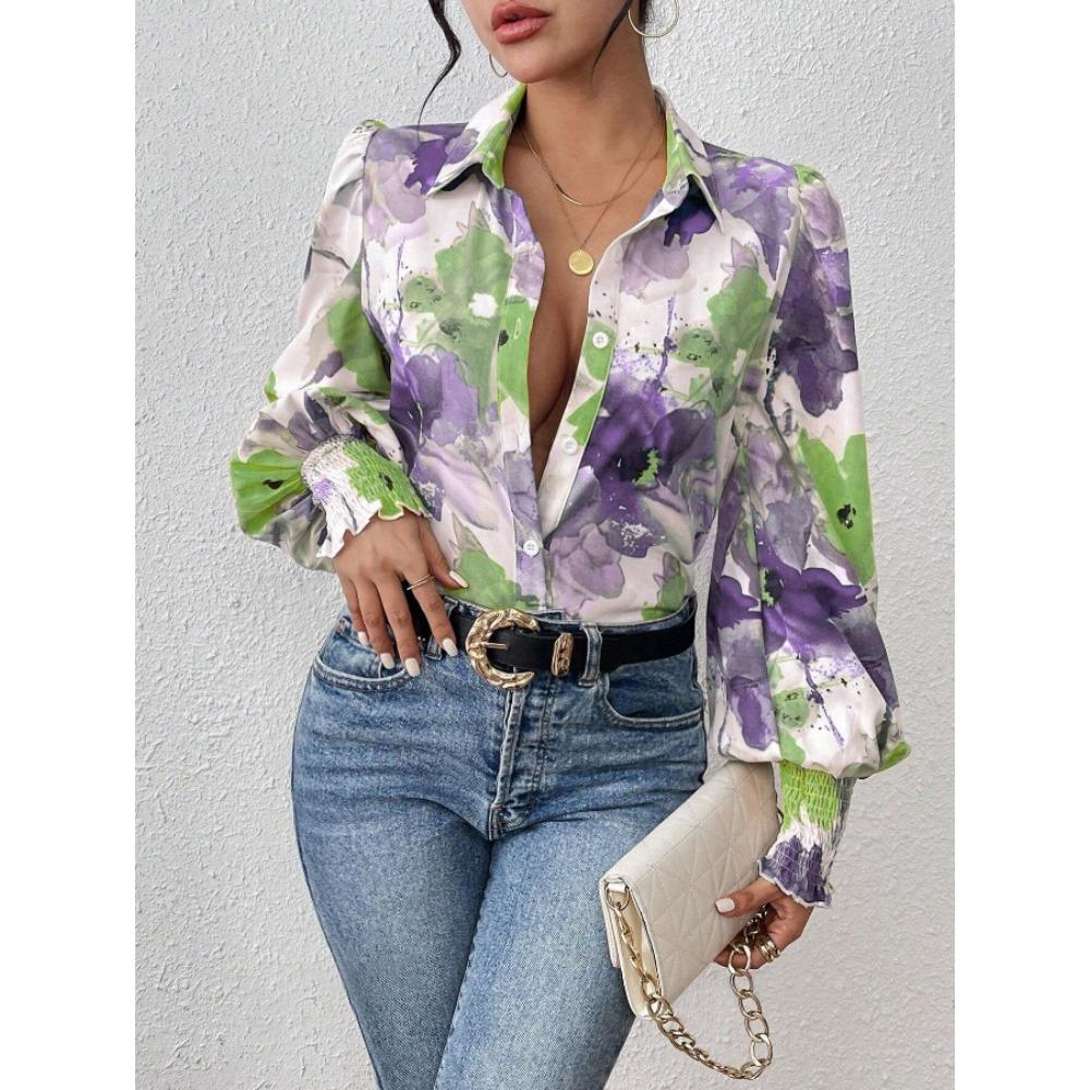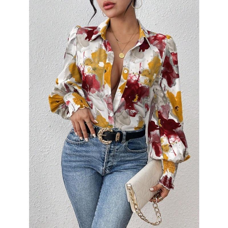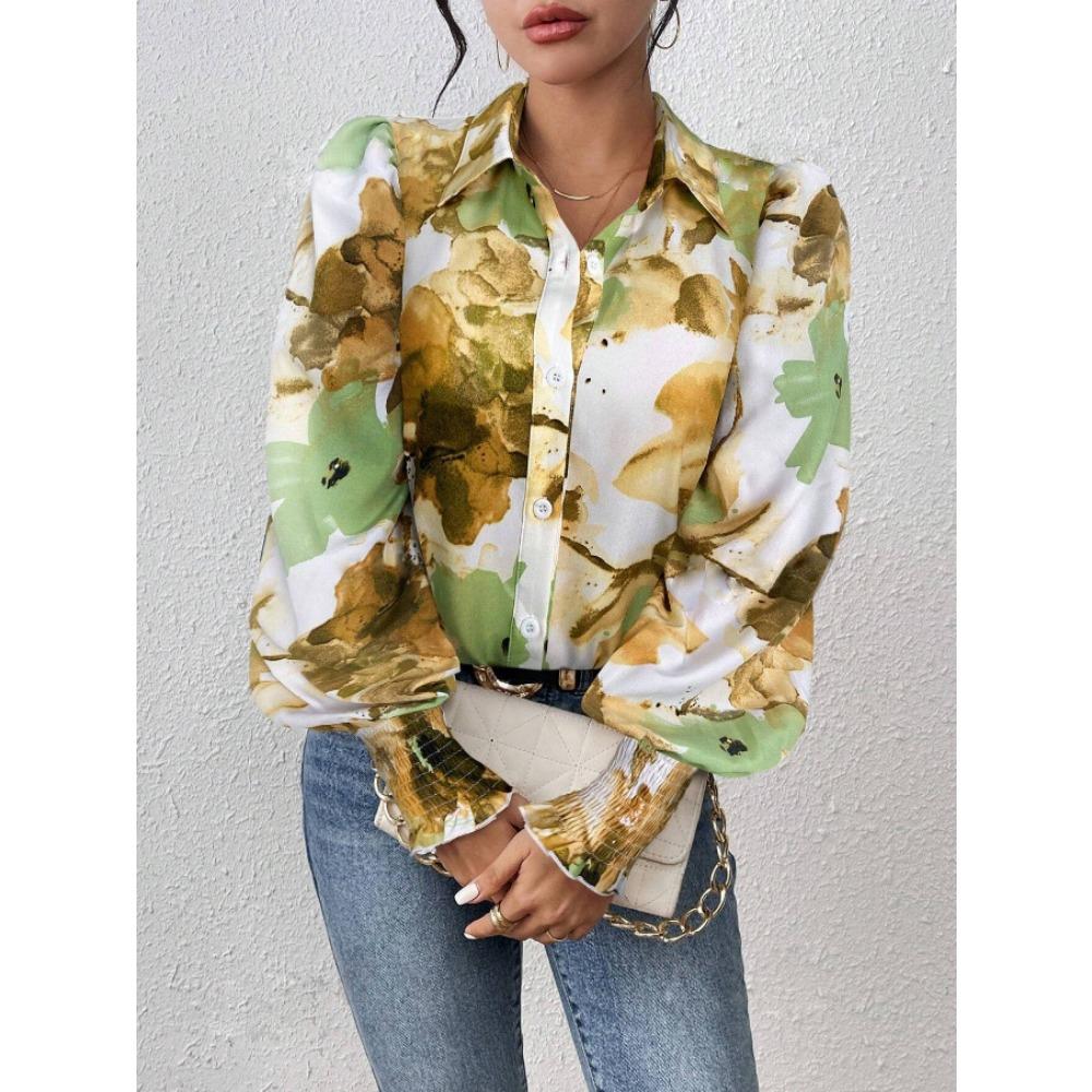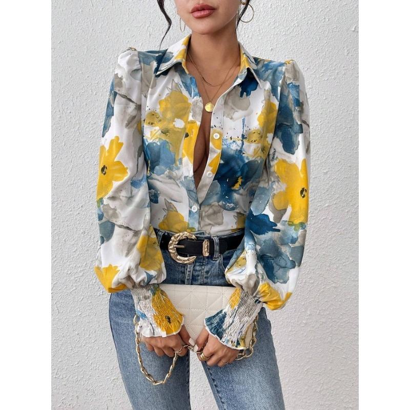 Рубашка с лацканами, рукавами-пузырями, длинными рукавами, свободного кроя, с принтом